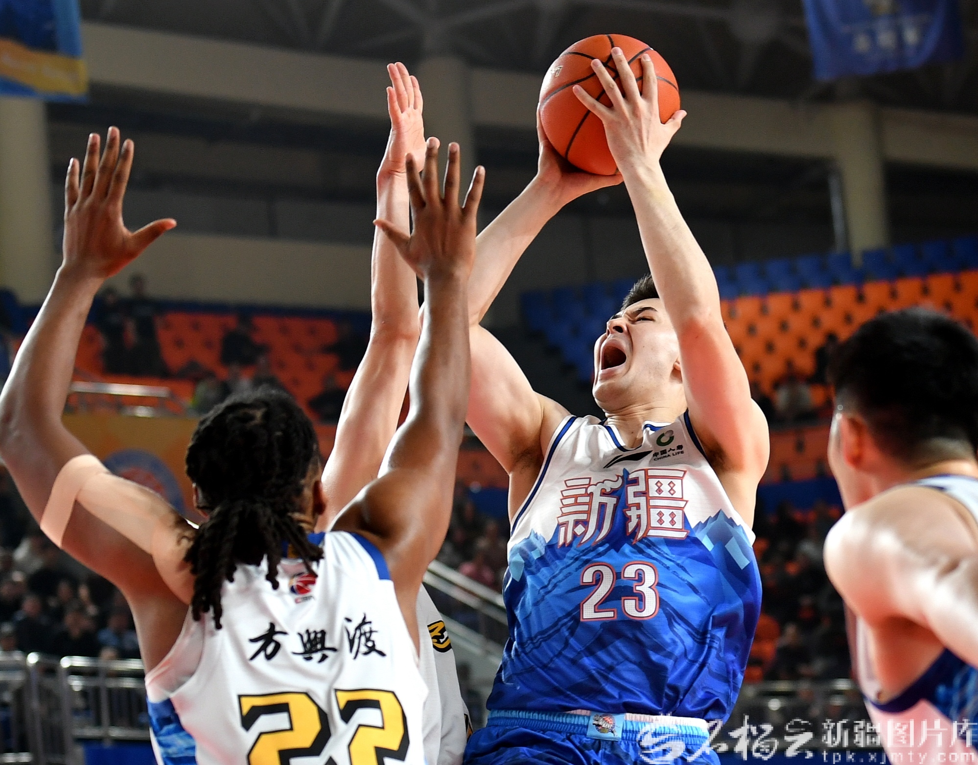 1月13日,新疆男篮队员阿不都沙拉木(右)强攻上篮。当日,2025-2026赛季CBA常规赛第14轮上演焦点对决,新疆男篮主场迎战卫冕冠军浙江广厦男篮。此战新疆队在前三节领先,但在第四节落了下风,最终以73:80不敌对手。石榴云/新疆日报记者 邹懿摄