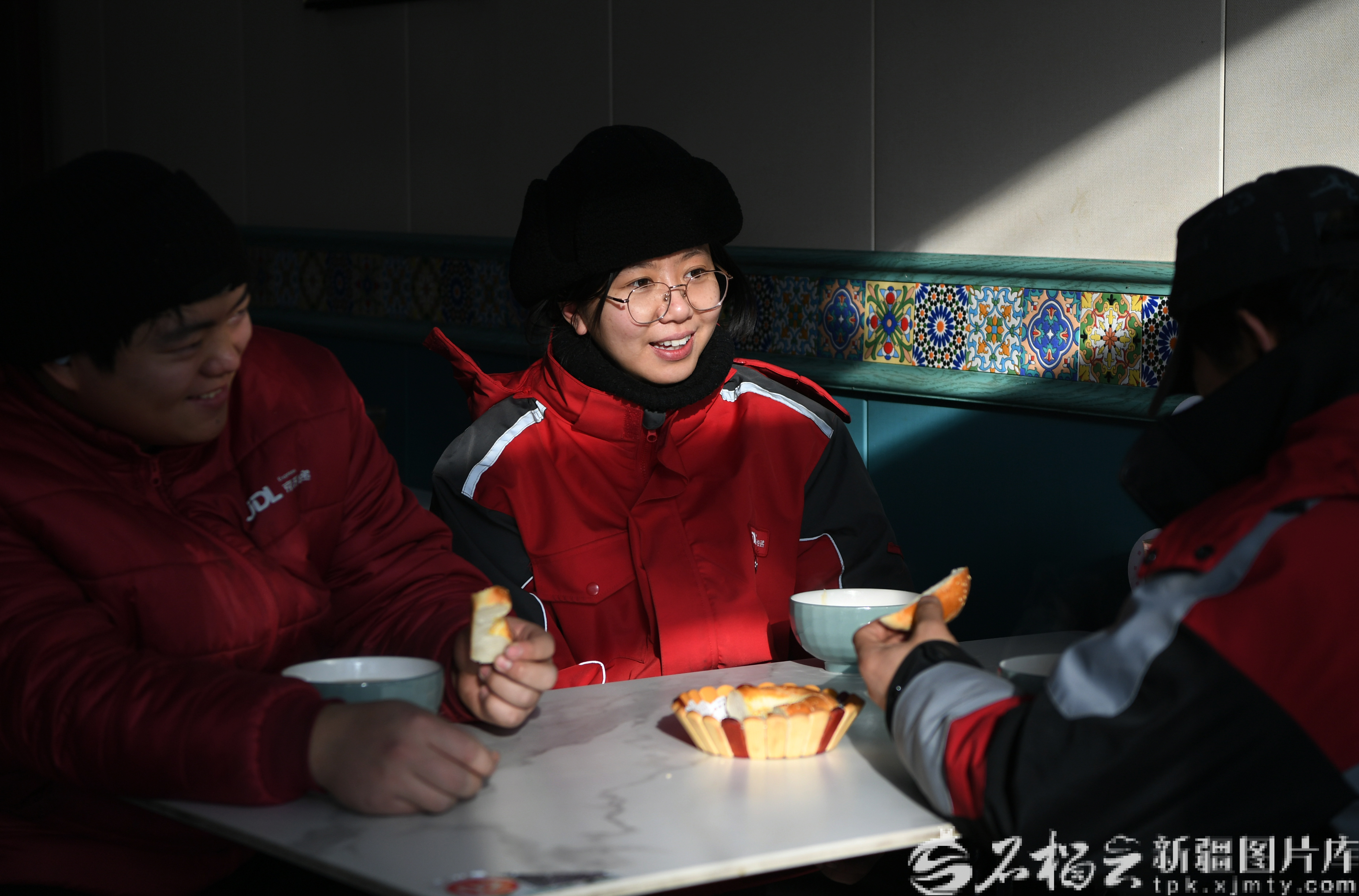 1月13日,几名快递员在位于乌鲁木齐市口岸路上的一家餐厅喝奶茶。该餐厅也是一个暖“新”驿站,每天都会为快递员们提供免费奶茶。石榴云/新疆日报记者 秦梅花摄