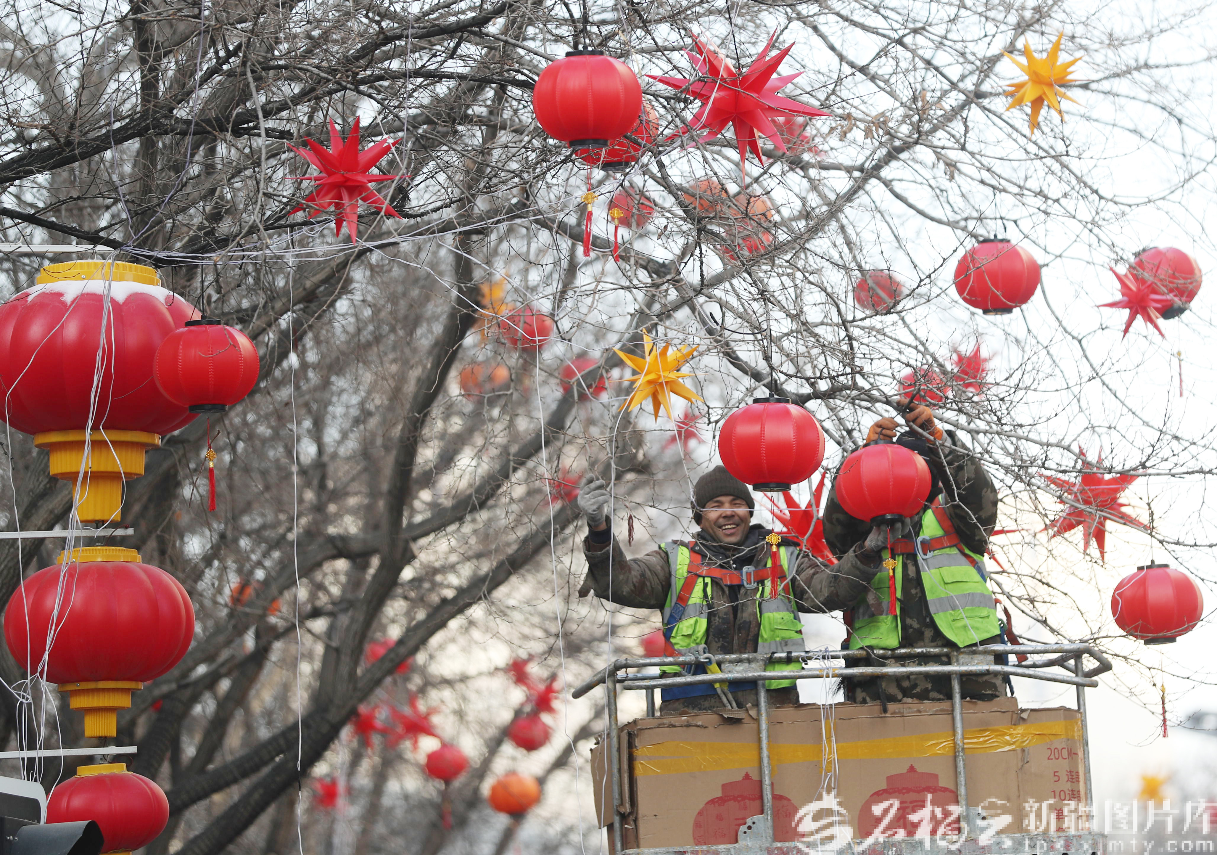 2月3日,工作人员在乌鲁木齐市中山路段组装花灯。