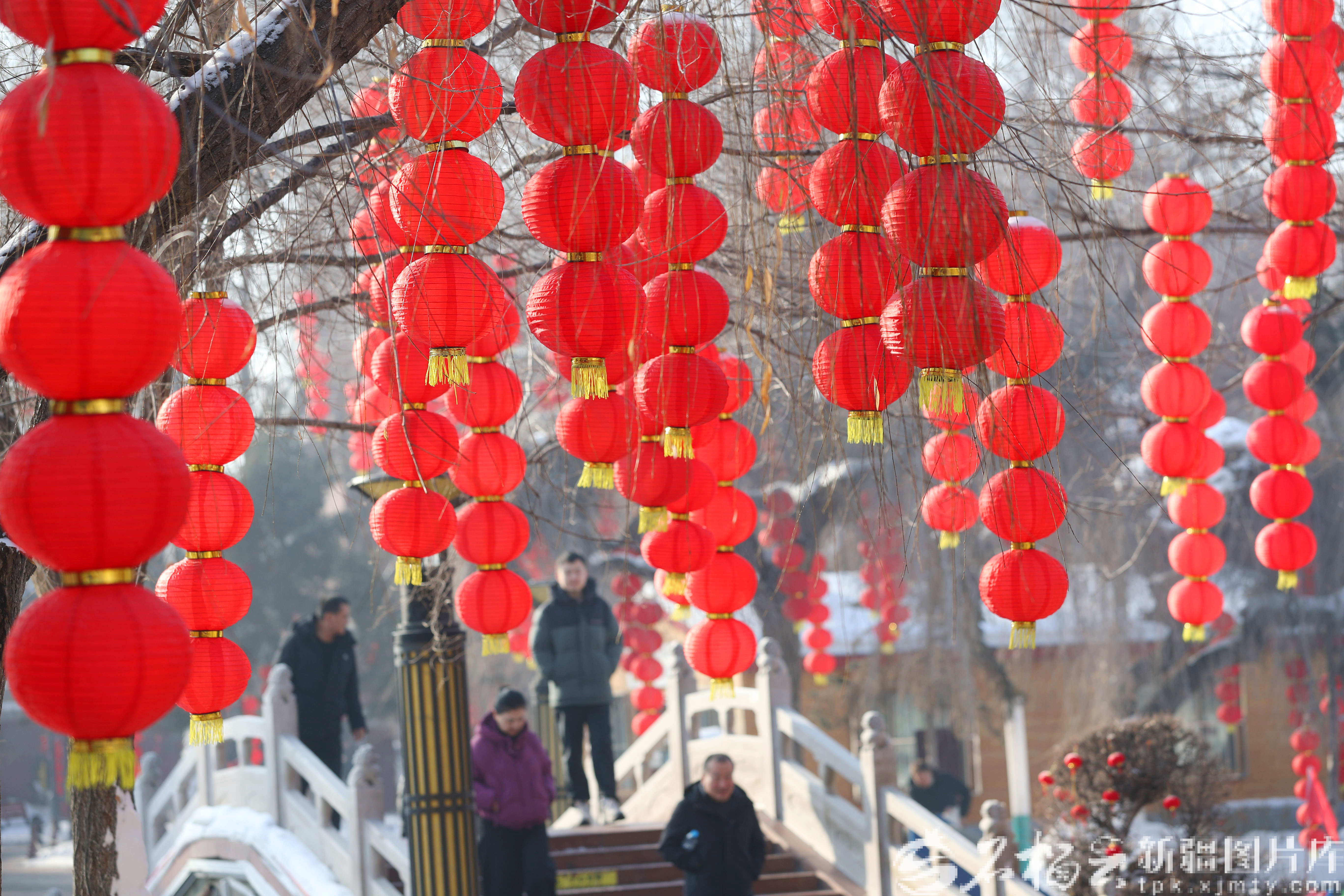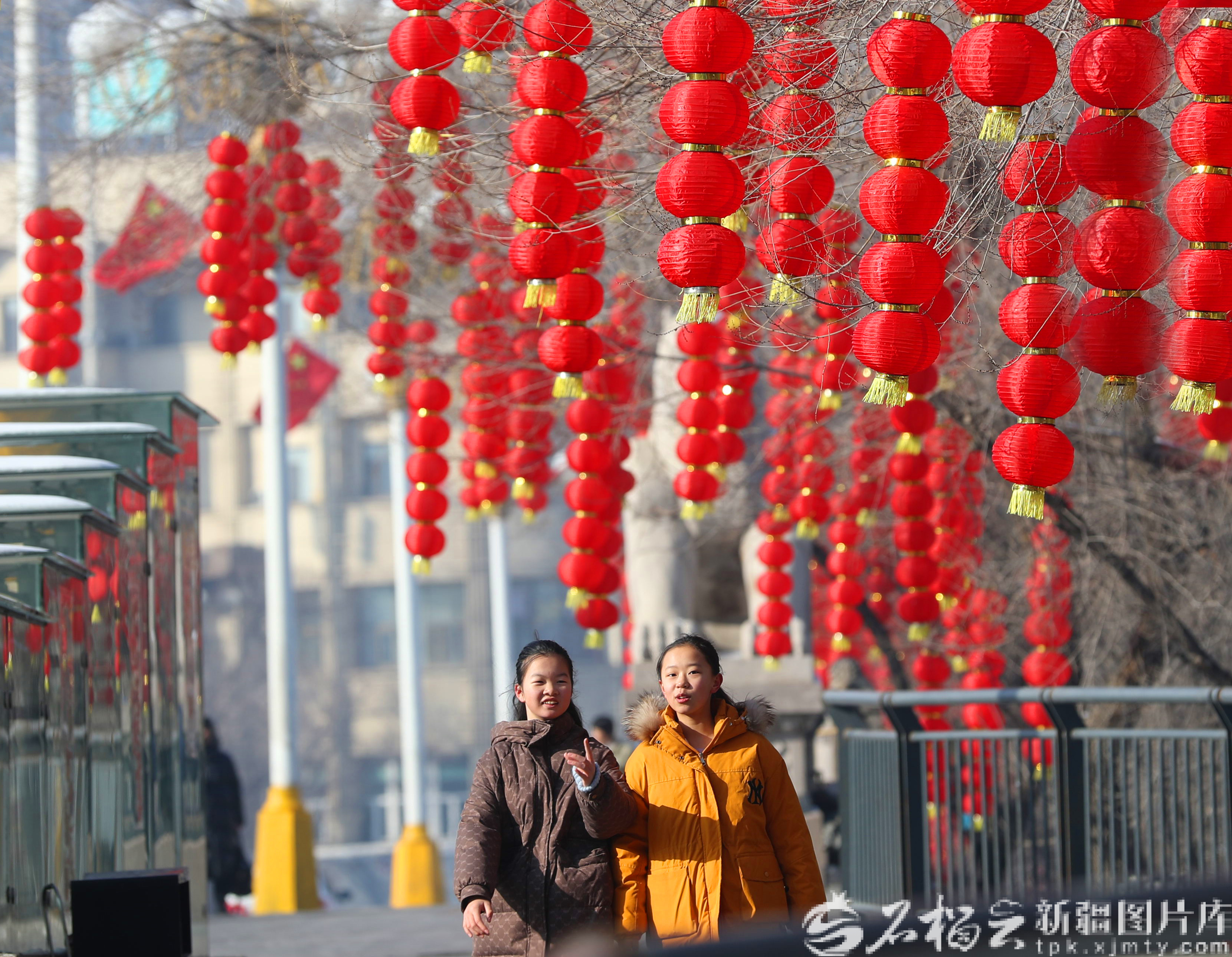 2月3日,市民从乌鲁木齐市西大桥附近高挂的红灯笼下走过。