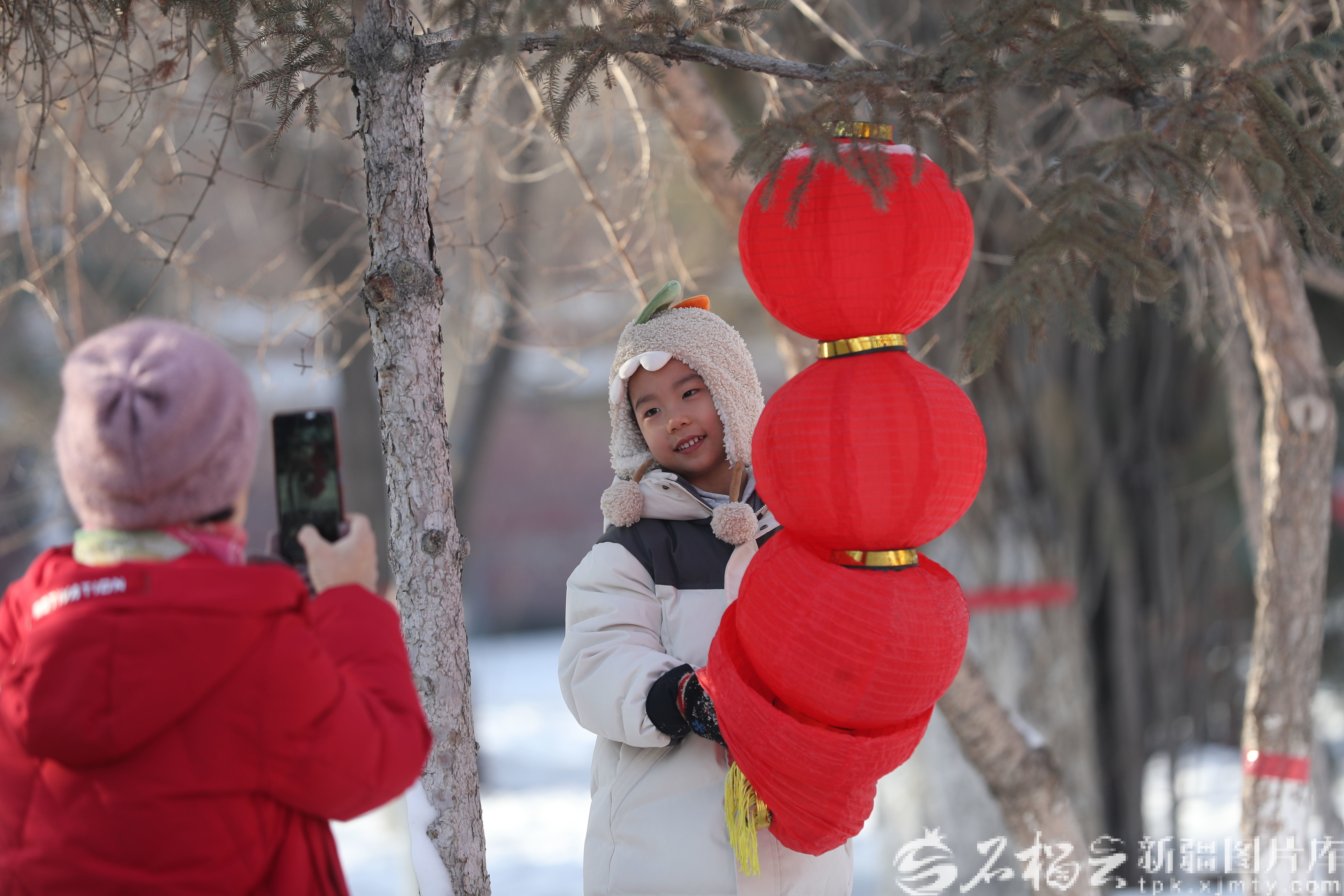 2月3日,市民在乌鲁木齐市街头拍照。