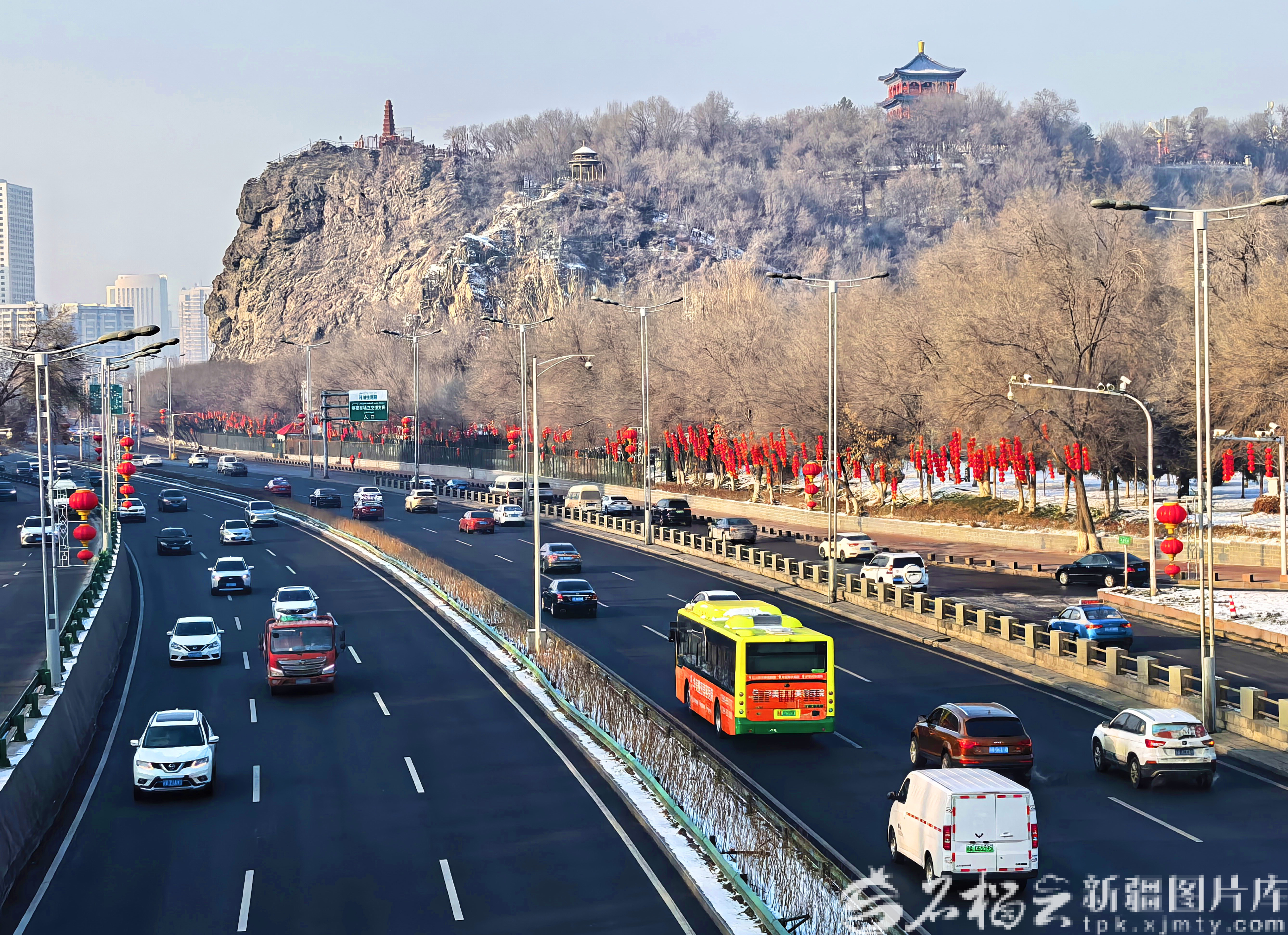 2月3日,乌鲁木齐市河滩快速路两侧挂满了喜庆的红灯笼。