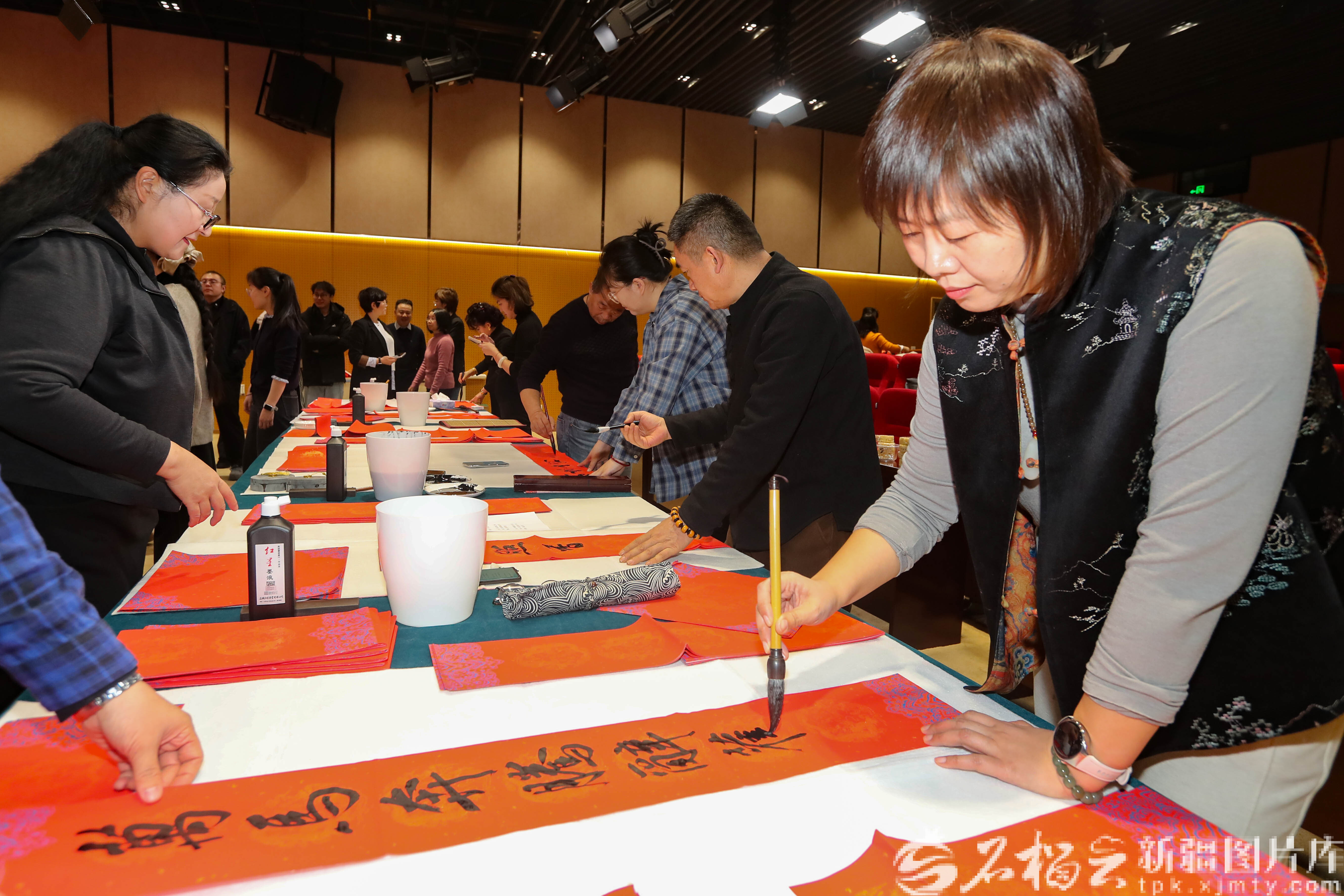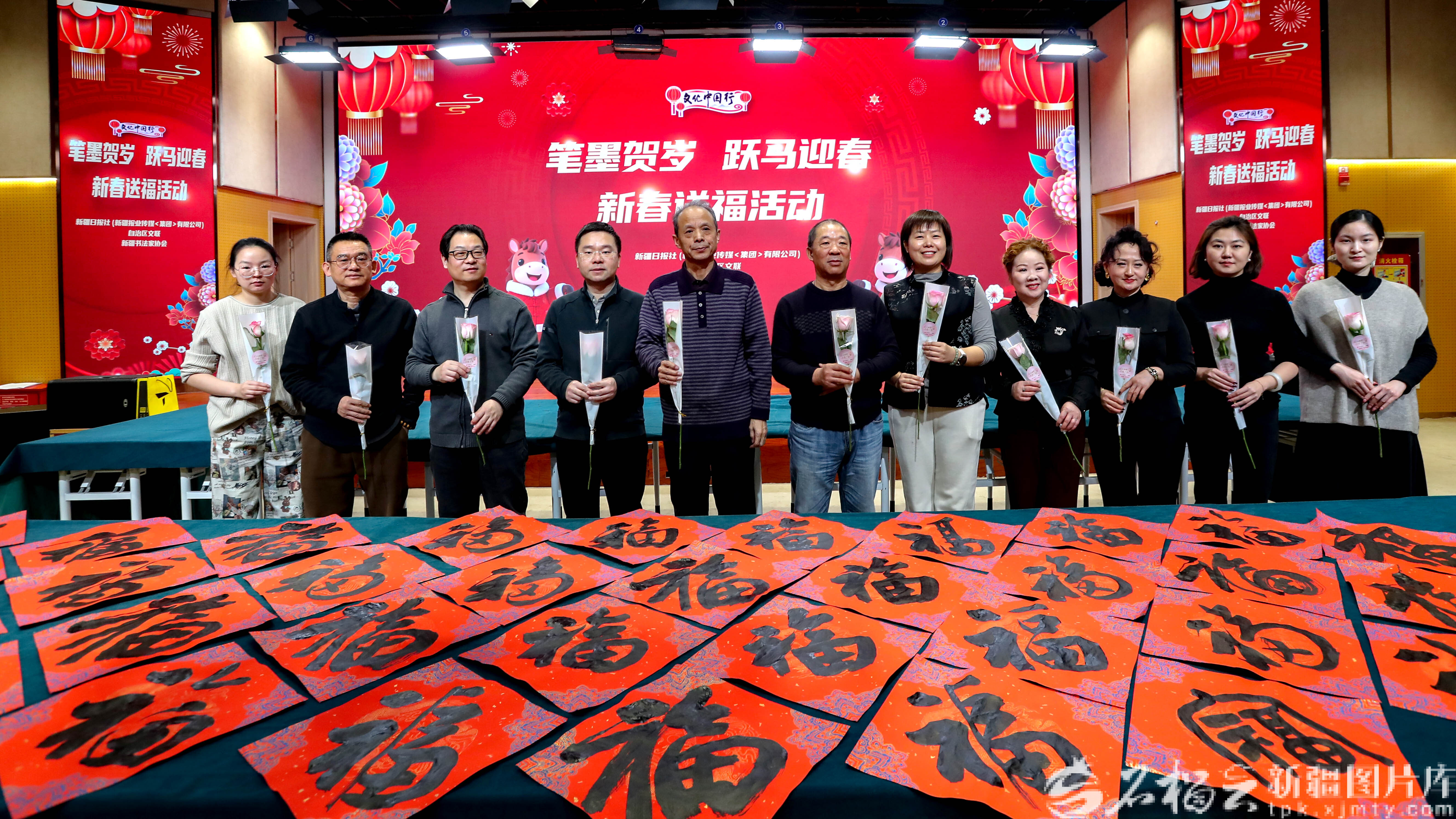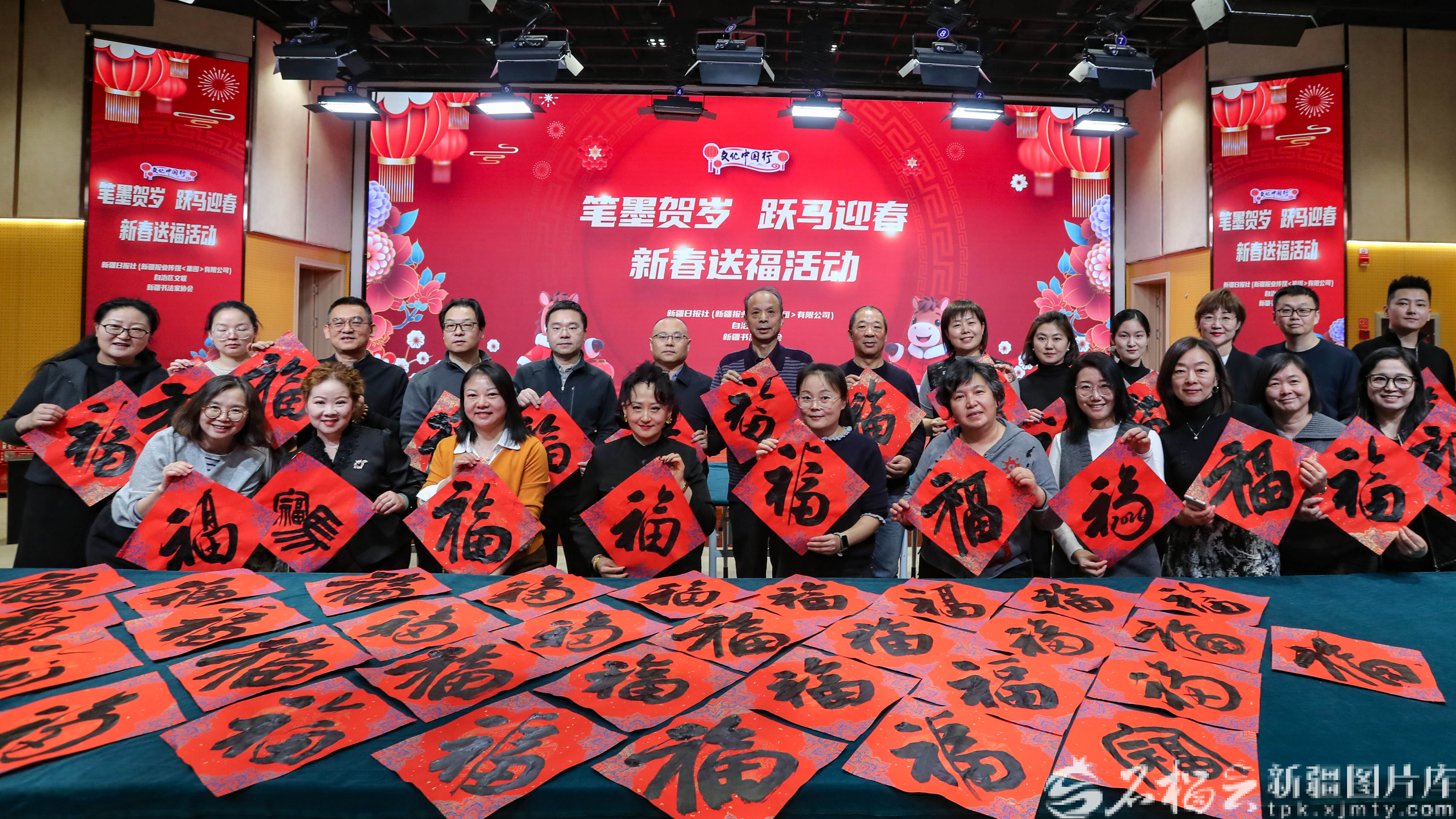 石榴云/新疆日报讯(记者 蔡增乐摄影报道)2月3日,“笔墨贺岁 跃马迎春”新春送祝福活动在新疆日报社(集团)多功能厅举行。红纸铺展,墨香四溢,十余位书法家挥毫泼墨,现场书写并赠送春联、“福”字,为广大干部职工送上饱含墨香年味的新春祝福,拉开了马年春节的喜庆序幕。