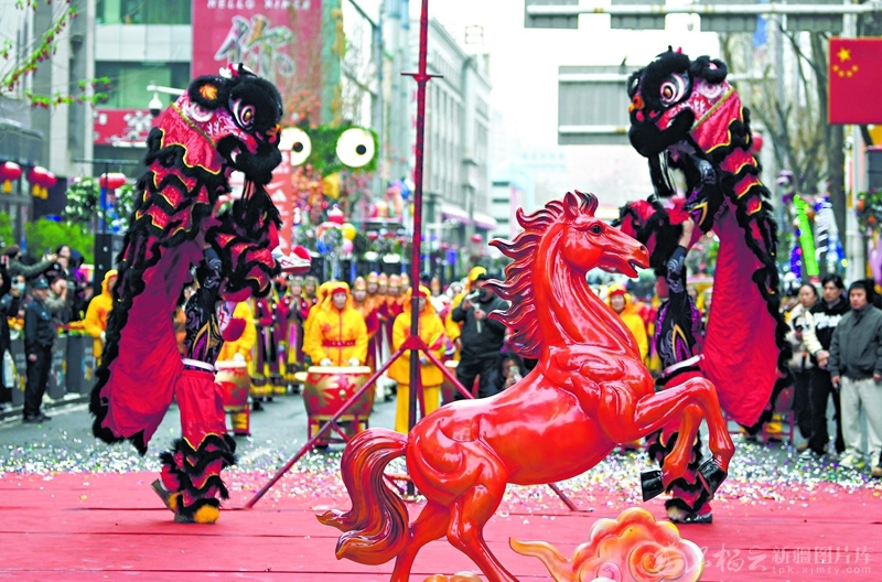 2月5日,社火队队员在表演舞狮。当日,乌鲁木齐市天山区大小西门商圈张灯结彩,一场别开生面的社火展演在此上演,为市民献上红火的新春盛宴。天山网-新疆日报记者汤永摄