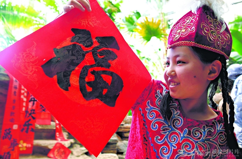 2月5日,小朋友与“福”字合影。当日,在托里县生态花房,一场文化惠民活动热闹开启,千余名各族群众身着节日盛装,在欢歌笑语中共迎新春。天山网-新疆日报记者韩亮摄