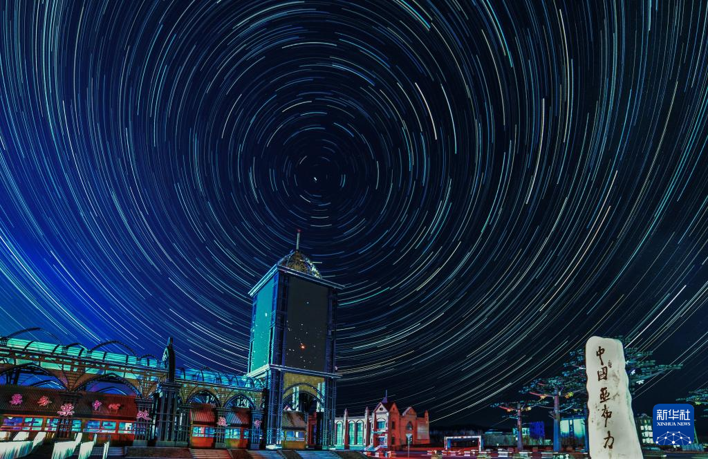 2025年12月14日拍摄的星空下的亚布力南站(堆栈合成照片)。新华社发(曾东摄)