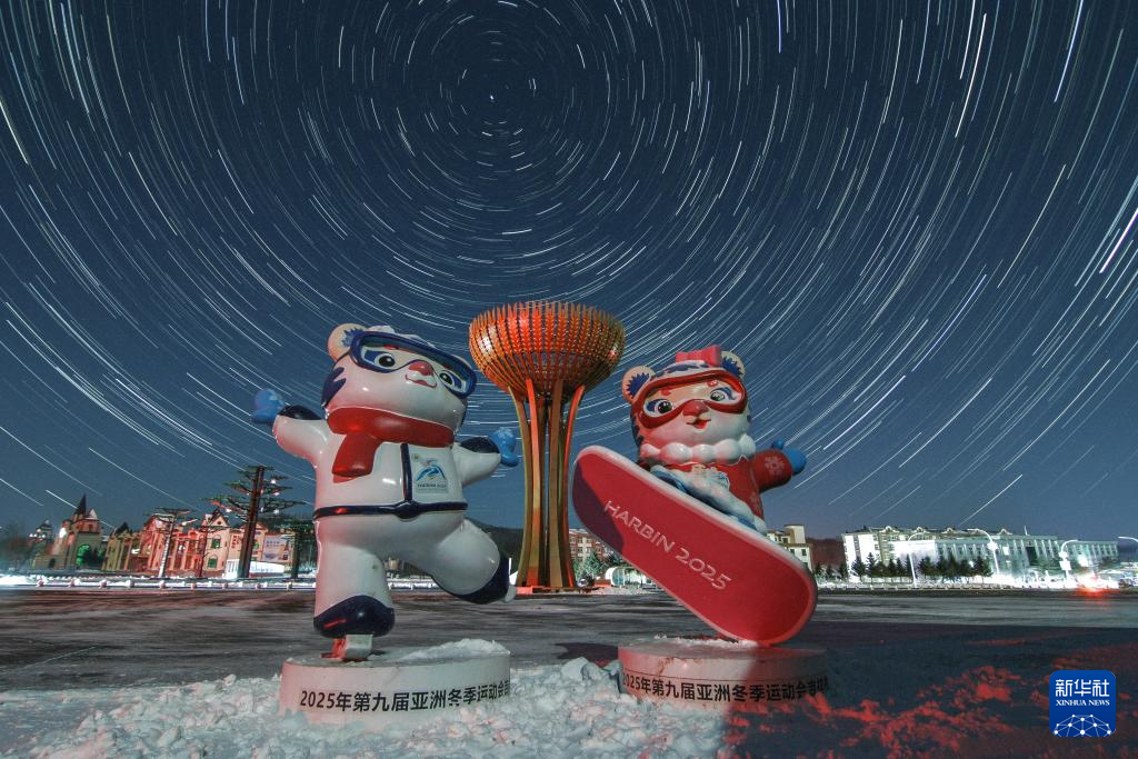 2月7日在亚布力滑雪旅游度假区拍摄的星空下的第九届亚冬会吉祥物(堆栈合成照片)。新华社发(曾东摄)