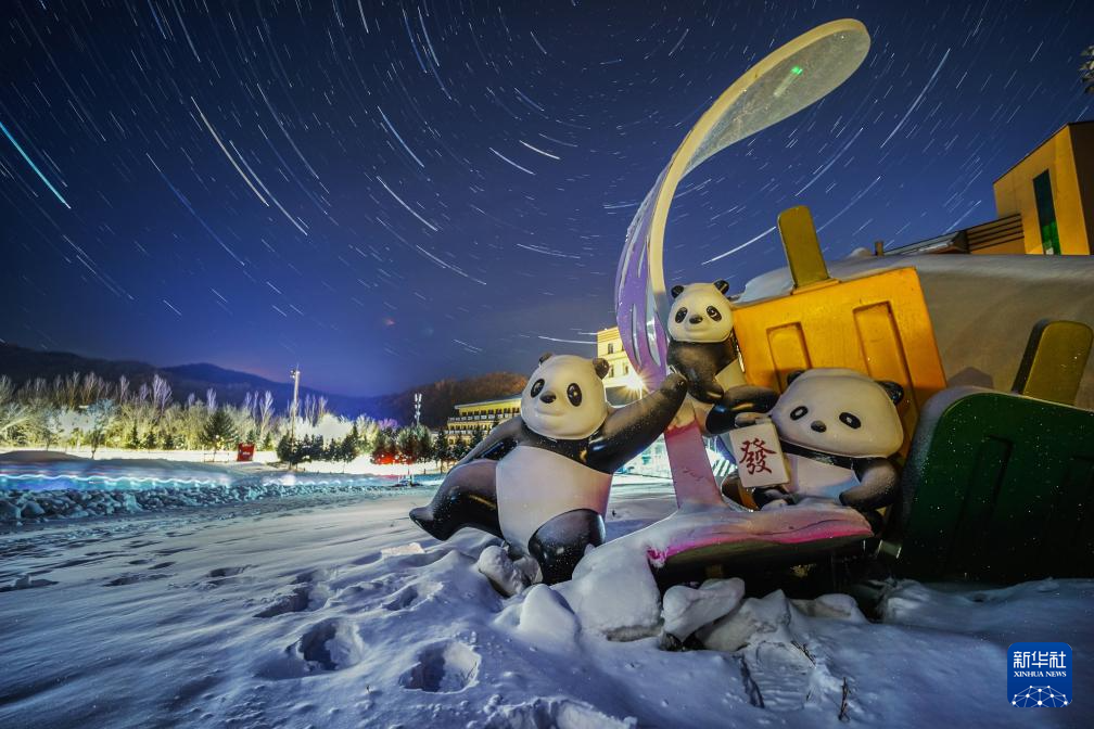 2025年11月28日在亚布力滑雪旅游度假区拍摄的星空下一处熊猫景观(堆栈合成照片)。新华社发(曾东摄)