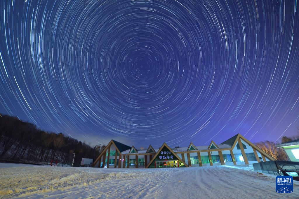 2025年12月9日在亚布力滑雪旅游度假区拍摄的星空下的熊猫馆(堆栈合成照片)。新华社发(曾东摄)