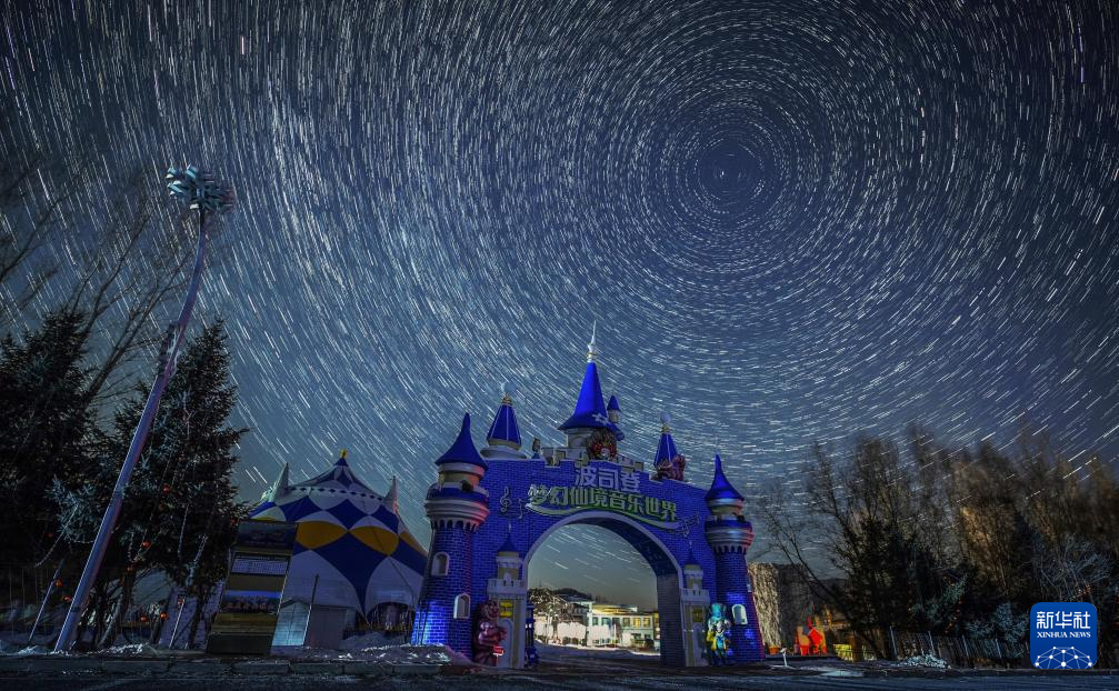 2025年12月30日在黑龙江亚布力滑雪旅游度假区拍摄的星空下的梦幻仙境音乐世界(堆栈合成照片)。新华社发(曾东摄)