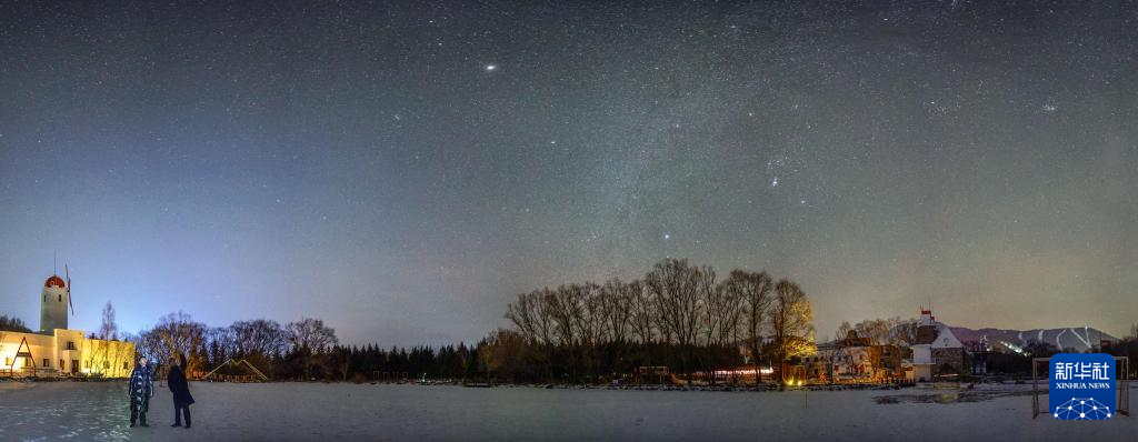 2025年12月14日在亚布力滑雪旅游度假区拍摄的星空中的“冬季大三角”和猎户座(拼接照片)。新华社发(曾东摄)