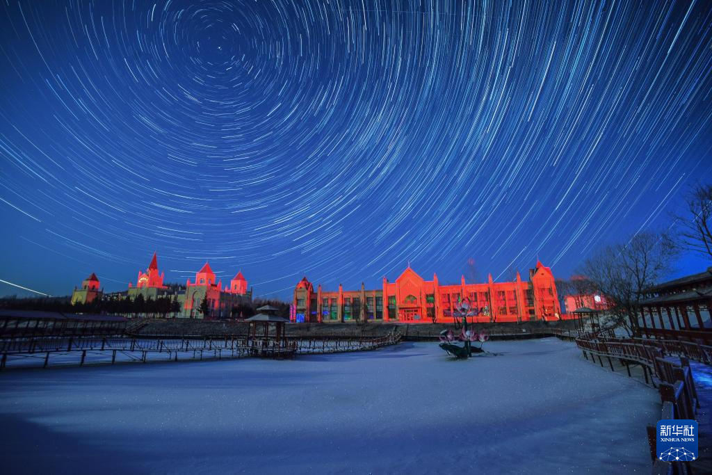 1月22日在亚布力滑雪旅游度假区拍摄的星空下的亚布力冰雪文化展馆(堆栈合成照片)。新华社发(曾东摄)
