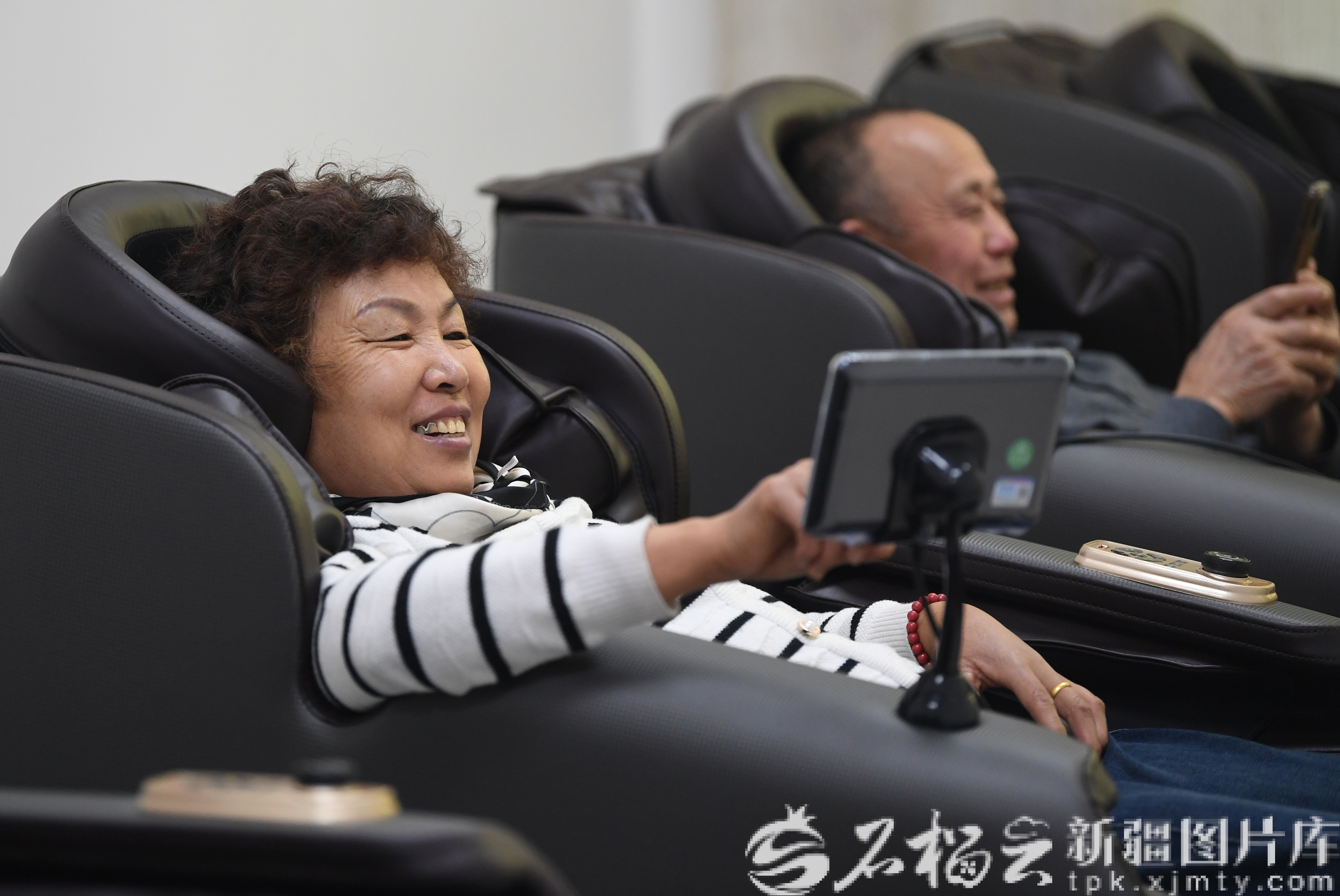 2月6日,裕民县老年康乐中心,老人在按摩椅上享受服务。