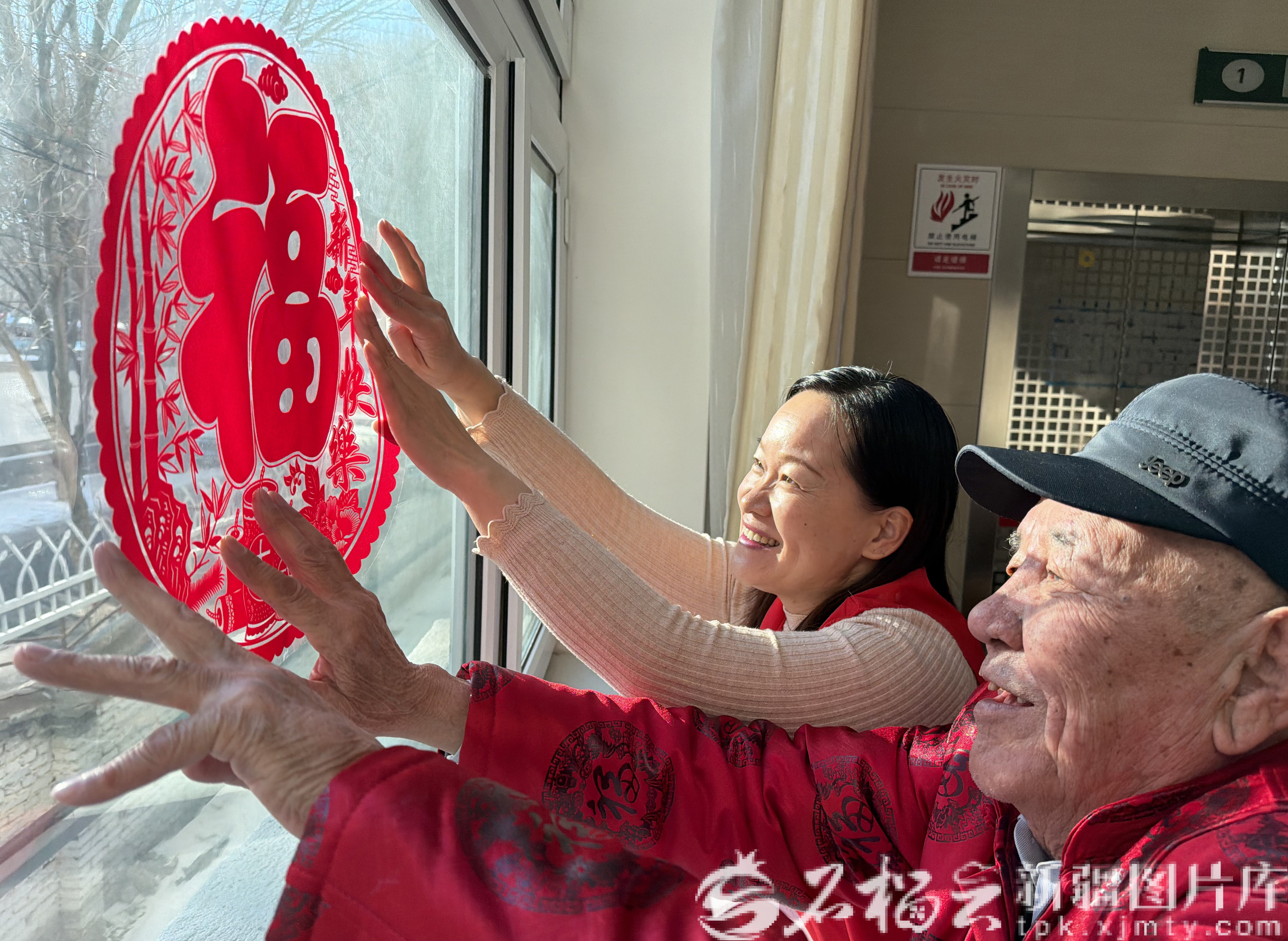 2月6日,裕民县社会福利园区工作人员与老人一起贴福字。