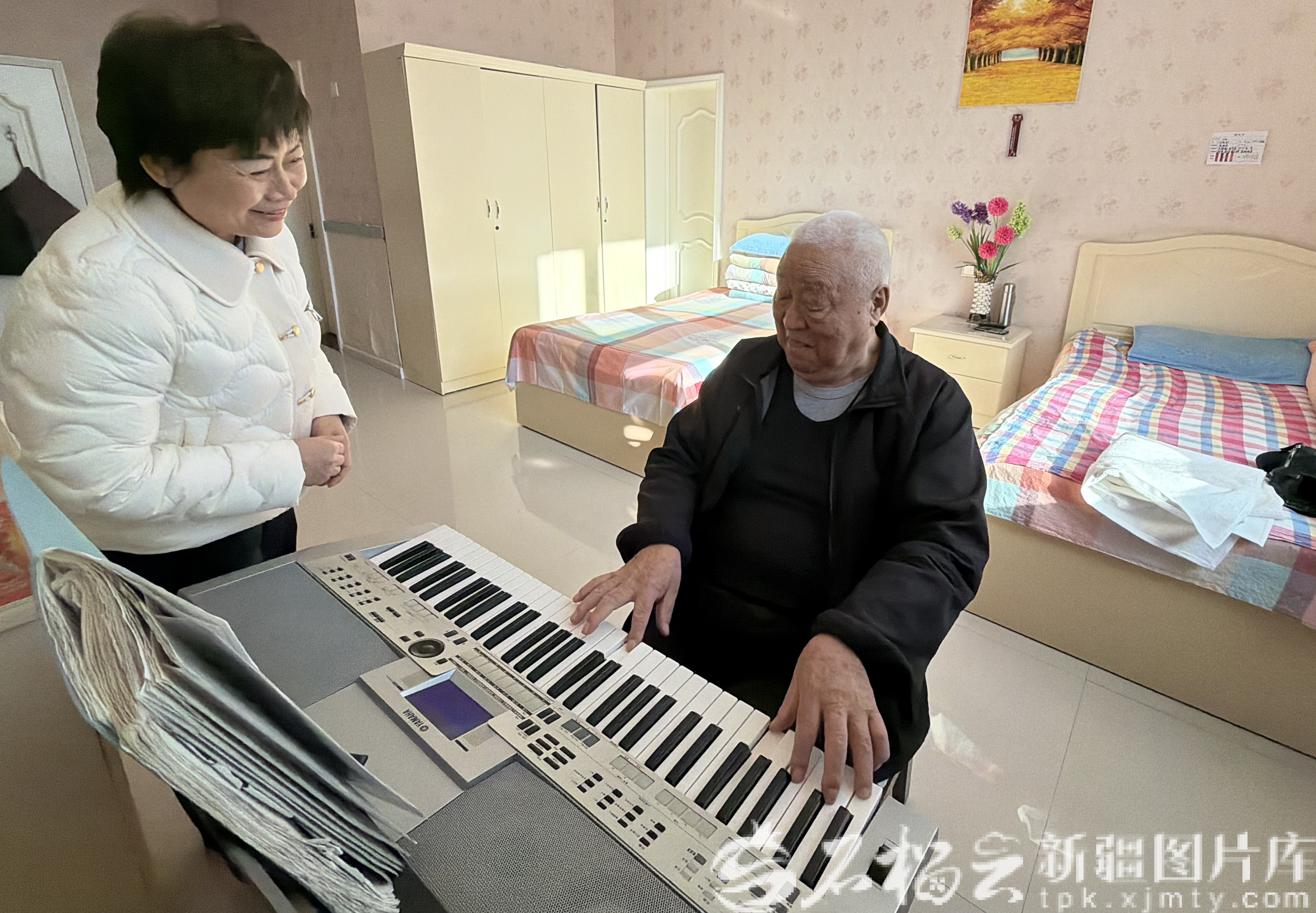 2月6日,老人在裕民县老年公寓弹奏电子琴。