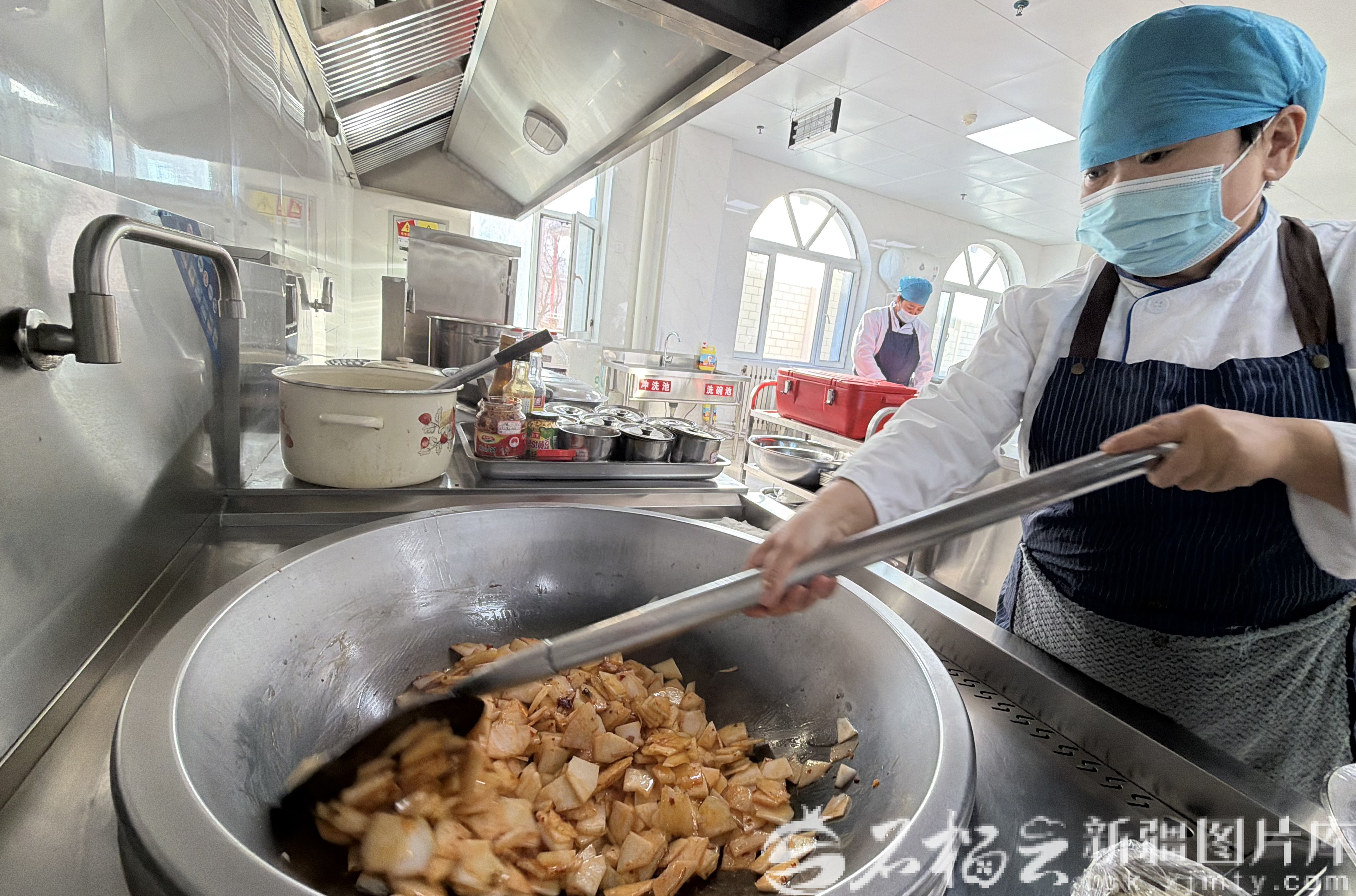 2月6日,裕民县社会福利园区工作人员给老人做午饭。