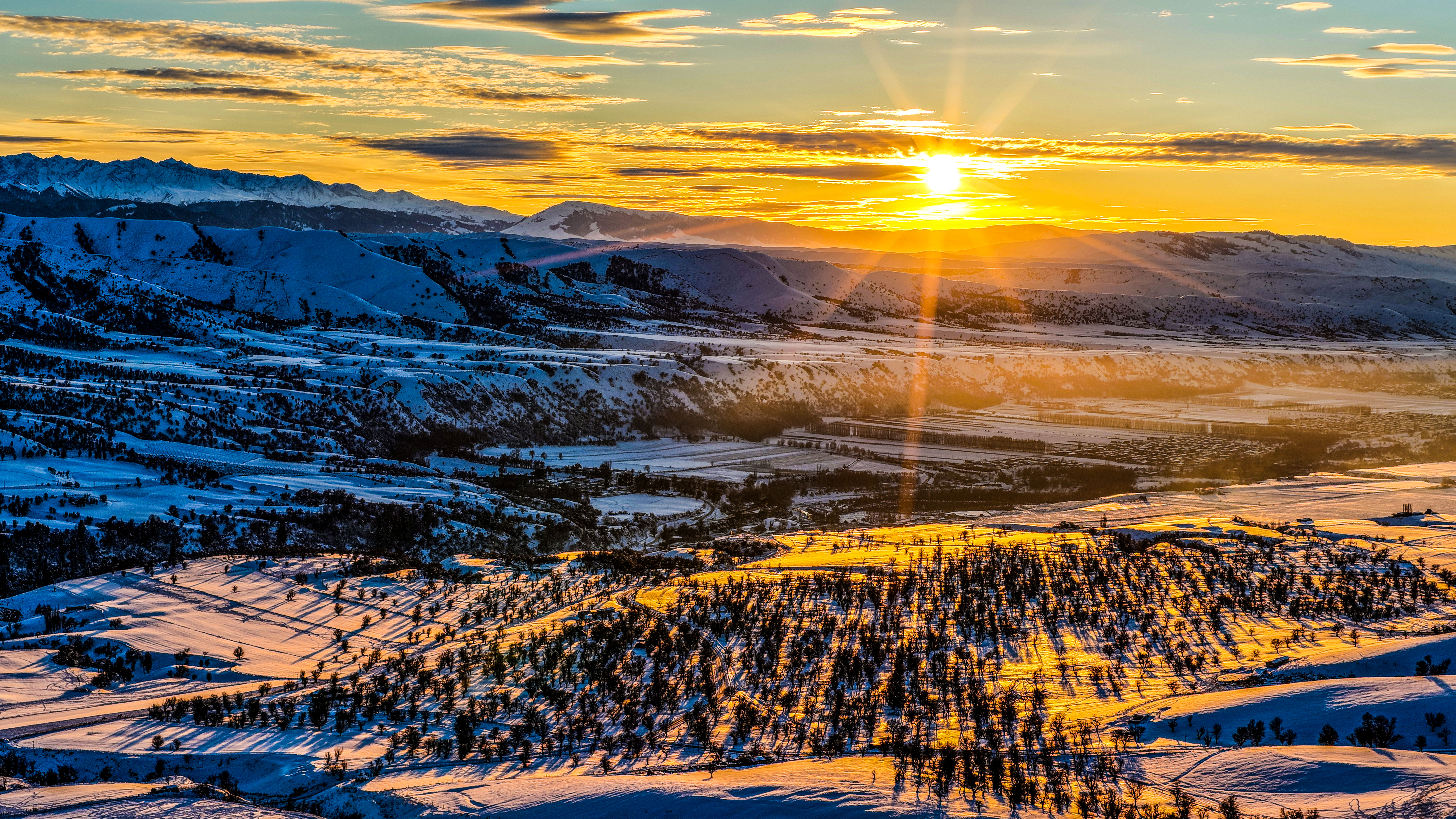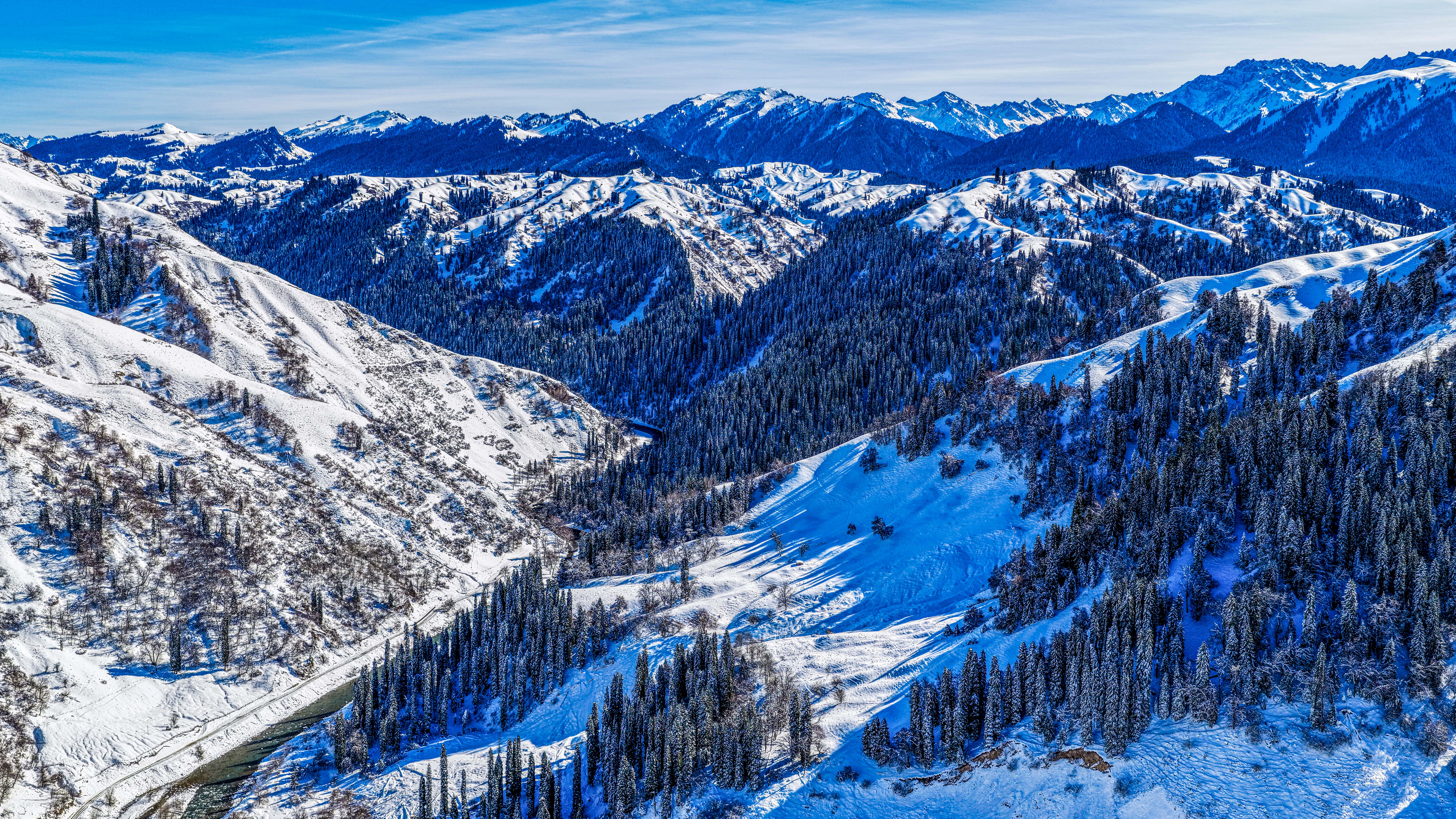 远山如黛,峰顶的积雪在阳光下闪烁着银辉,仿佛一条洁白的丝带,缠绕在山间。雪线以下,墨绿的云杉林若隐若现,层次分明,宛如大自然的调色盘。