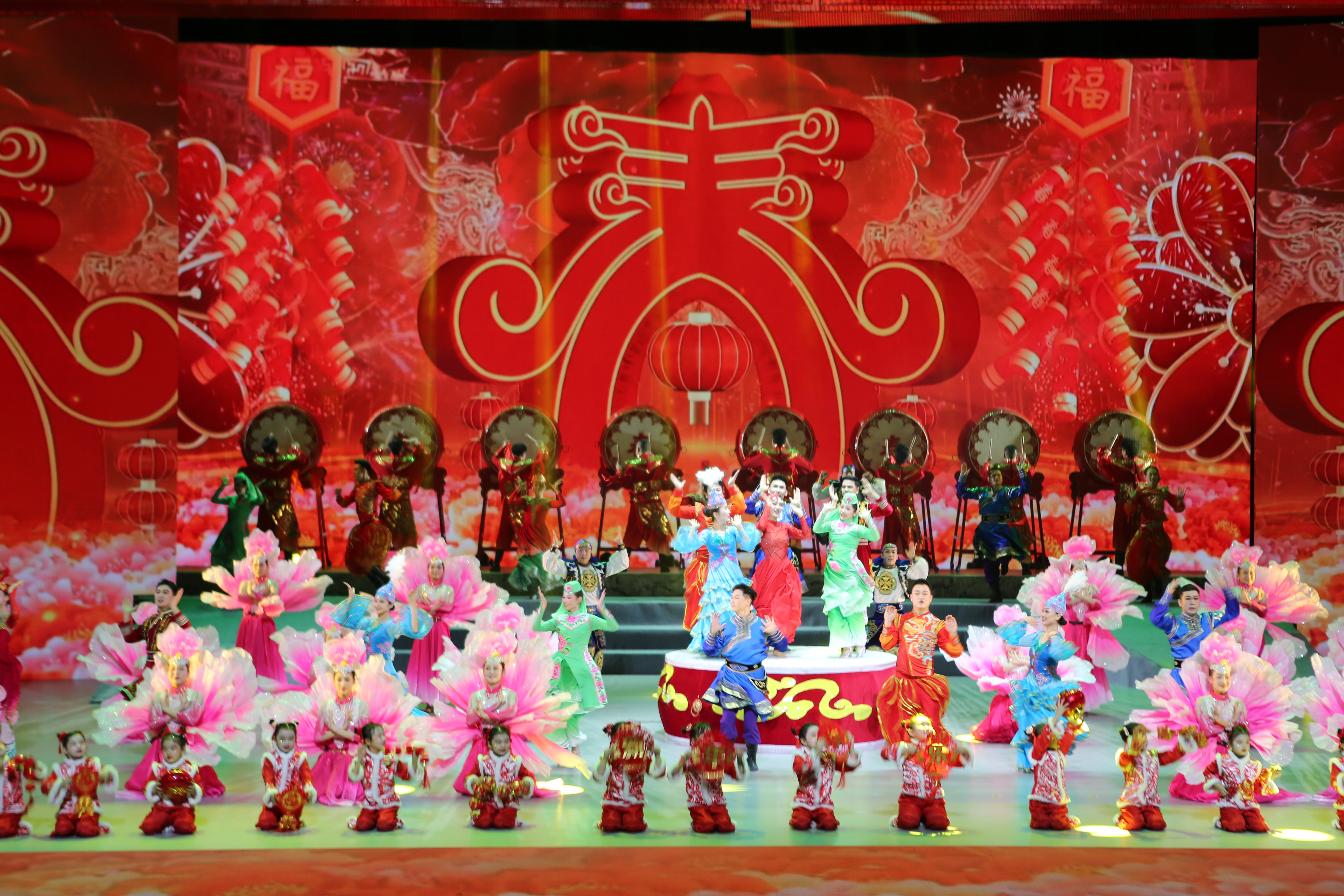 2月10日,演员在表演舞蹈《鼓舞迎春,福到博州》。当日,博尔塔拉蒙古自治州春节文艺晚会精彩上演,各族人民载歌载舞迎新春。孙明亮摄