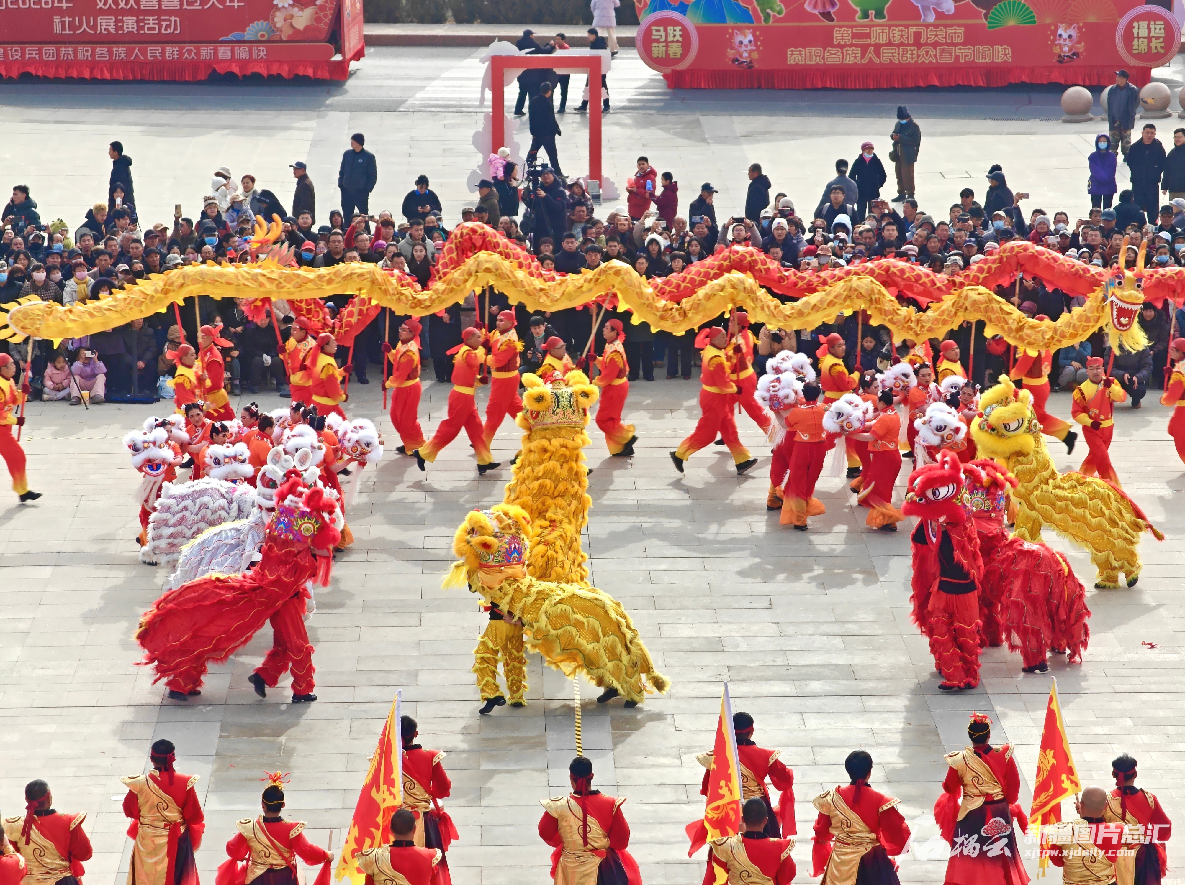 2月10日,铁门关市丝路雄关广场举行社火表演,来自阿拉尔市、铁门关市等地的社火队伍轮番亮相,各族职工群众在热闹的氛围中喜迎春节。 栗卫平摄