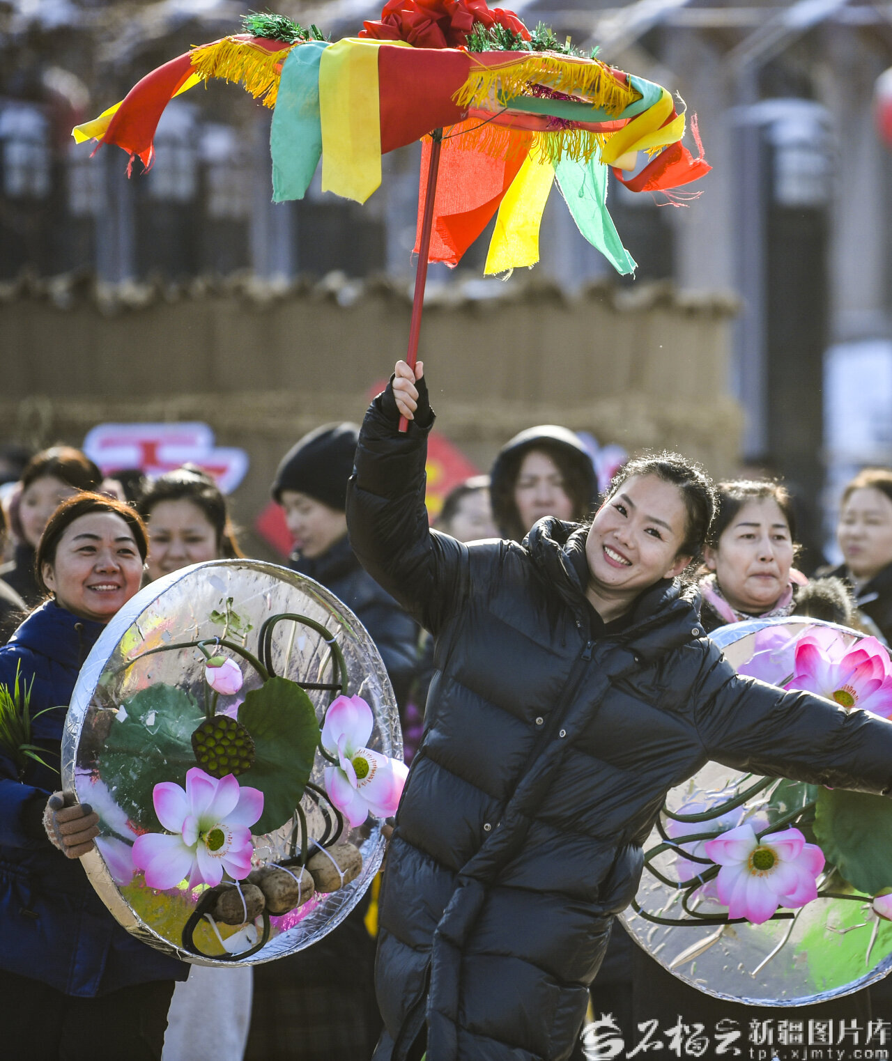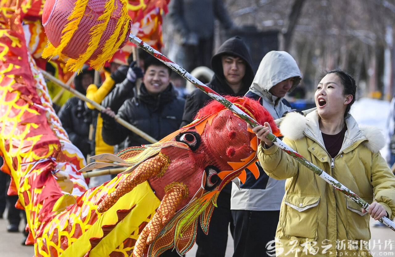 2月9日,张雅涵在米东区中心绿地广场和社火队员一起舞龙。