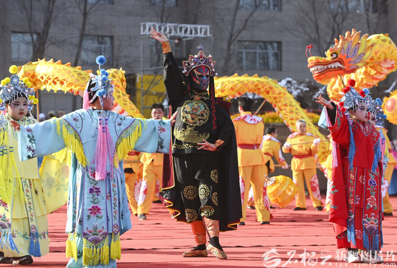2月10日,张雅涵在三道坝镇和社火队员一起表演社火。