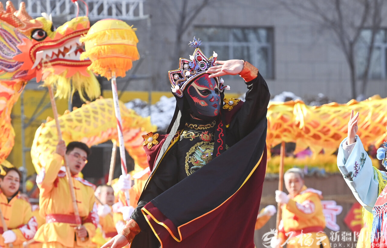 2月12日,张雅涵在米东区社火展演上表演川剧变脸。