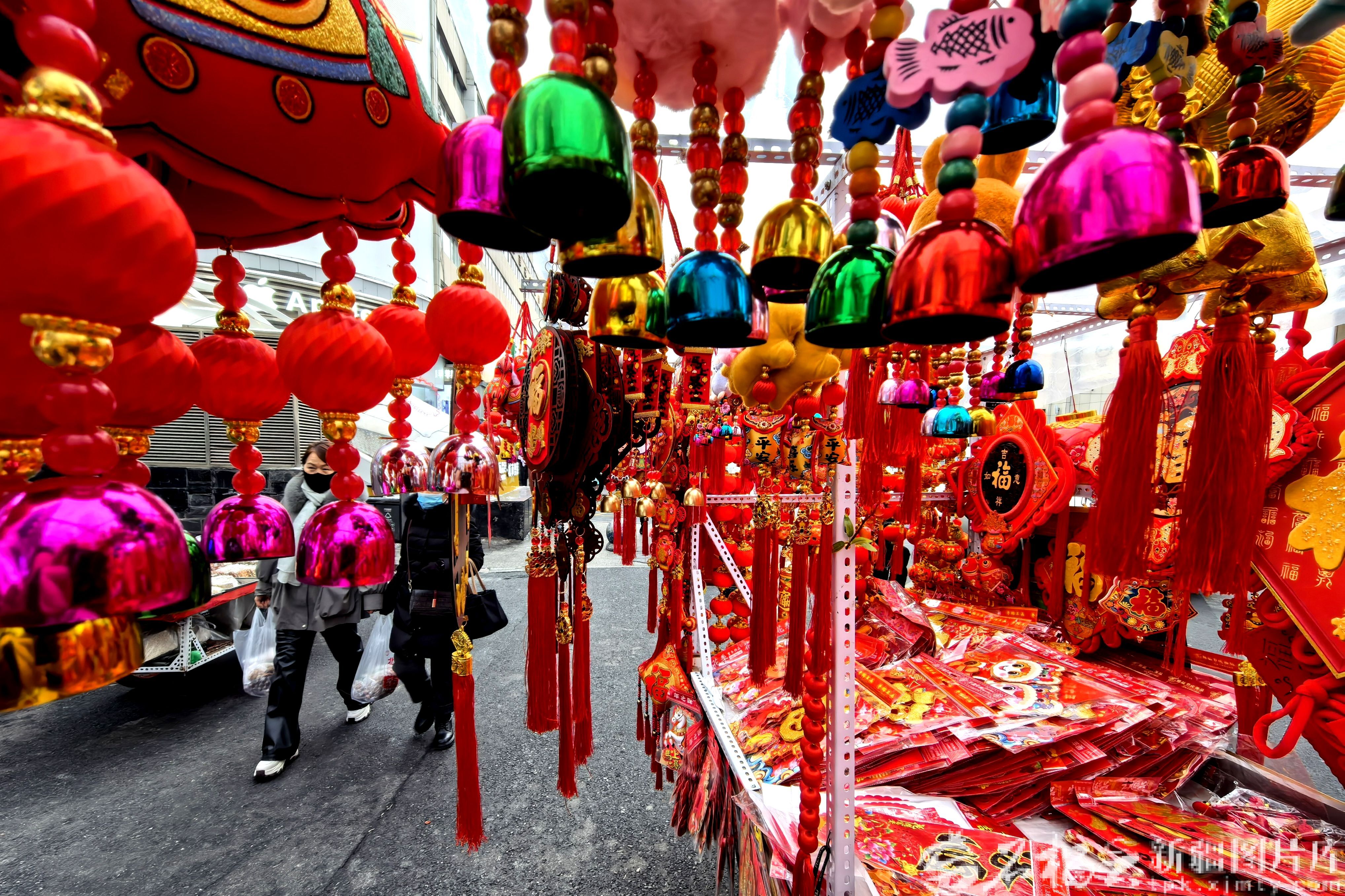 2月12日,乌鲁木齐市年货摊位上,福字、中国结、春联、灯笼等喜庆饰品琳琅满。石榴云/新疆日报记者 杨斌摄