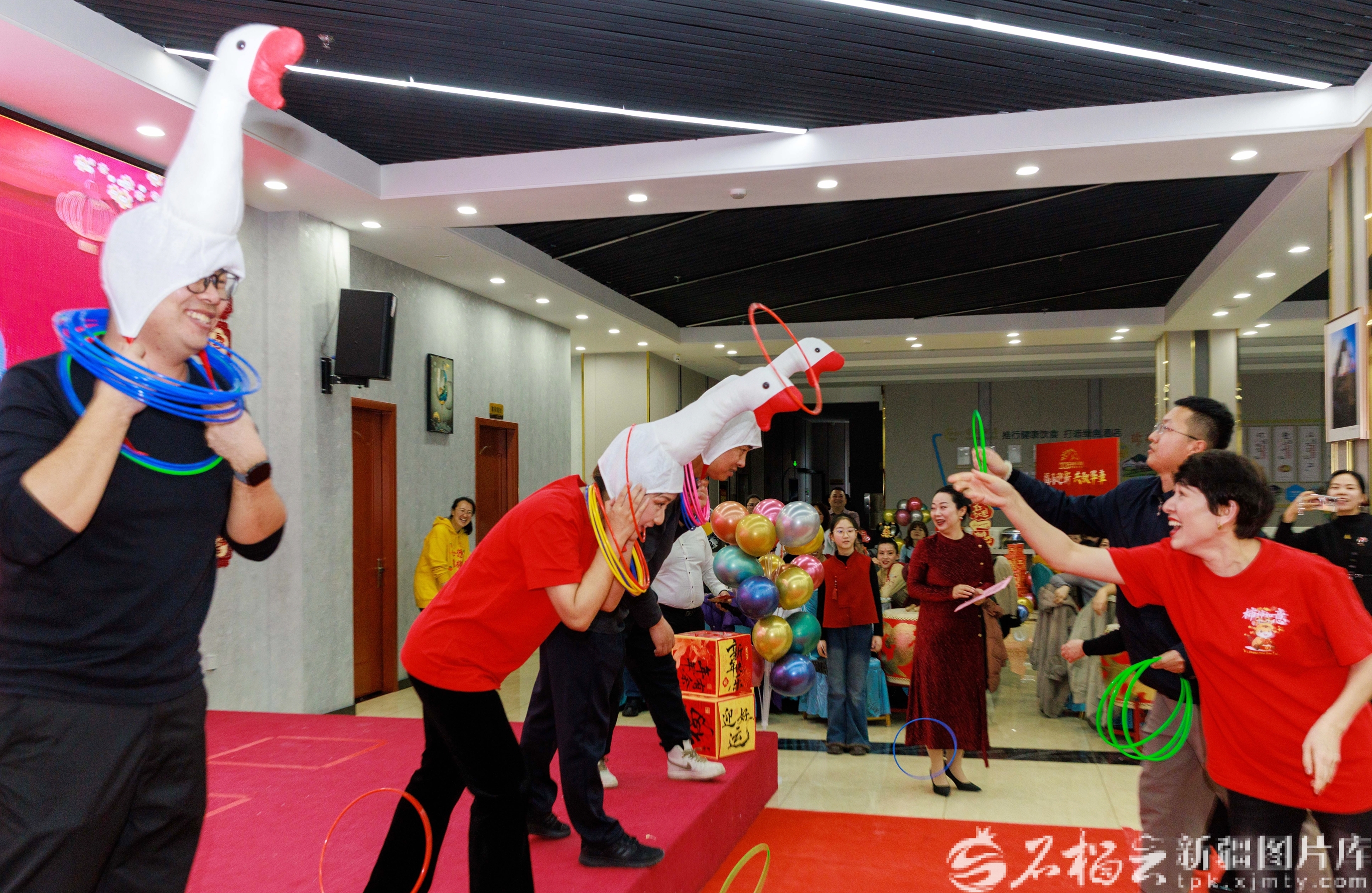 2月6日下午,乌鲁木齐市天山区黑甲山街道举办春晚,各族居民共迎新春佳节。图为居民们在趣味互动环节参加套圈游戏。图片由包粉镯提供