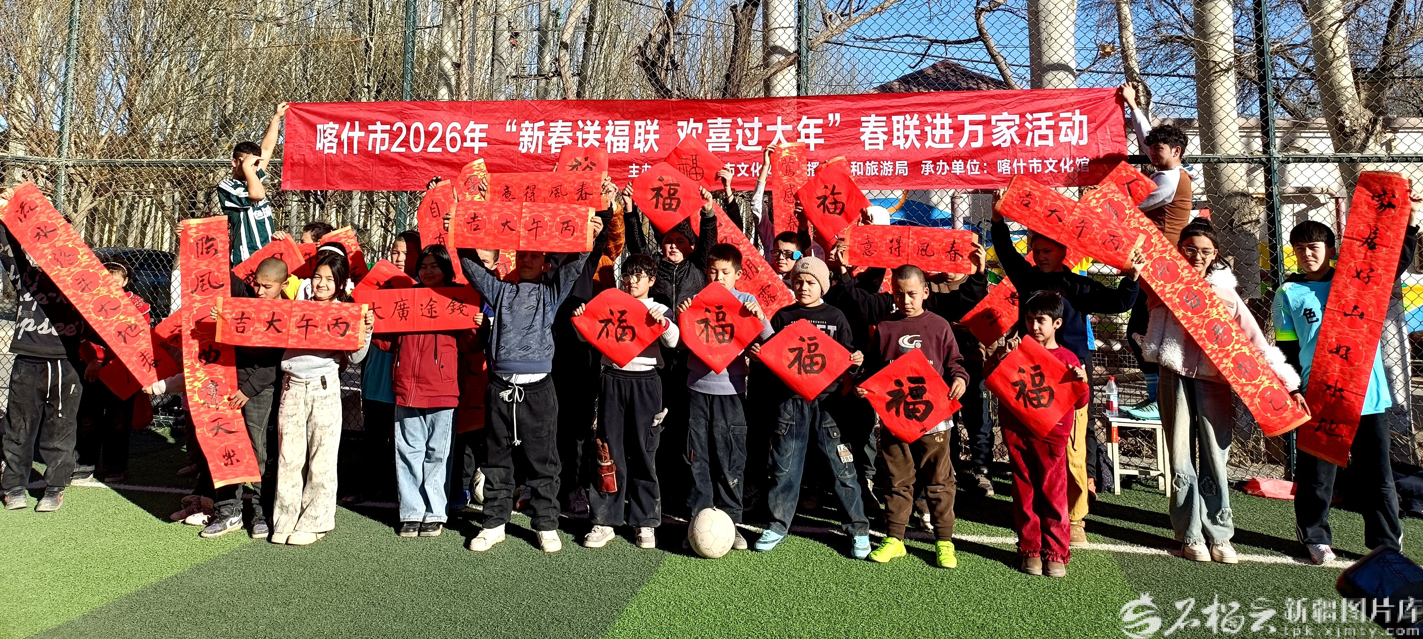 2月7日,喀什市色满乡村民们与工作人员共同手持福字、灯笼、春联合影。太来提江·阿不力米提摄