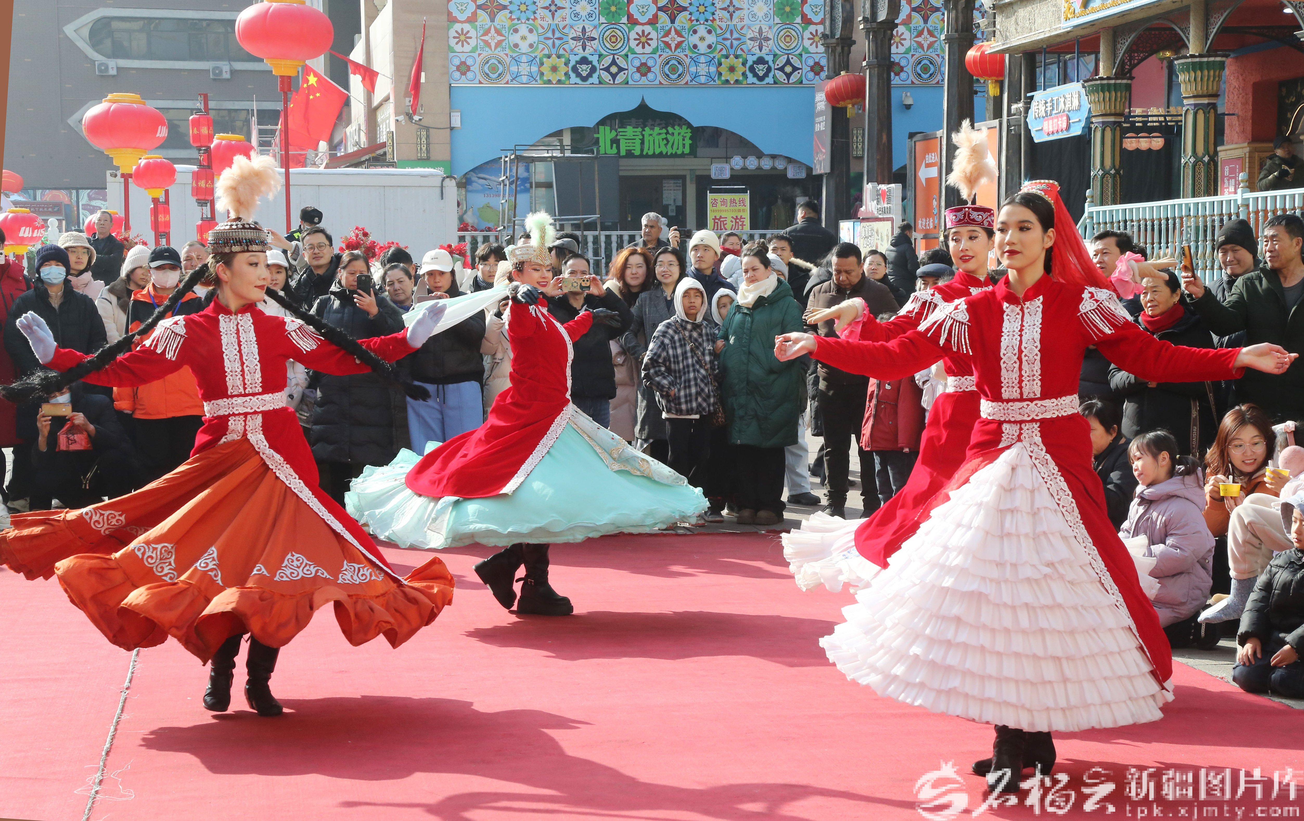 2月14日,游客在新疆国际大巴扎步行街二期疆来城欣赏歌舞。石榴云/新疆日报记者 李雄心摄