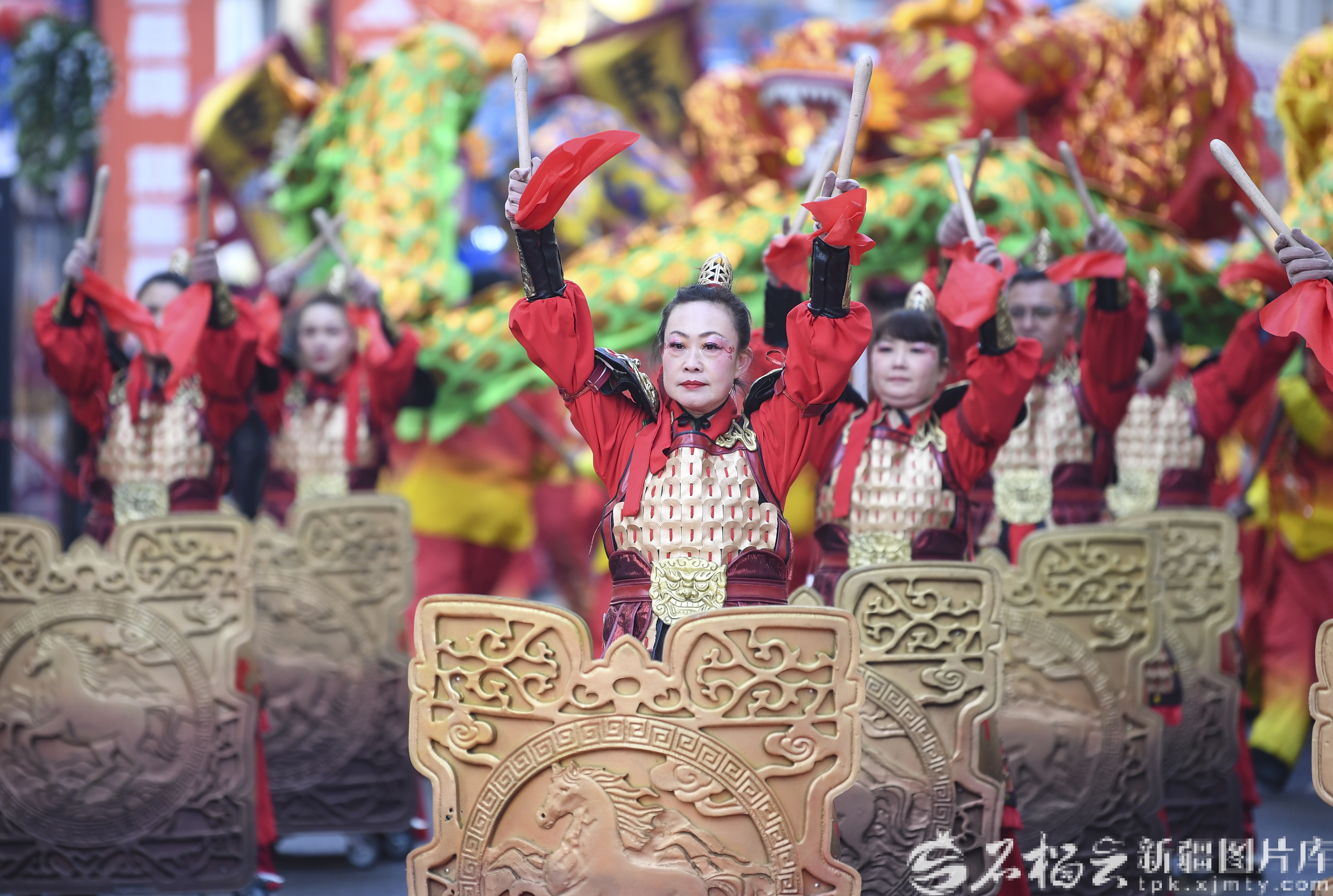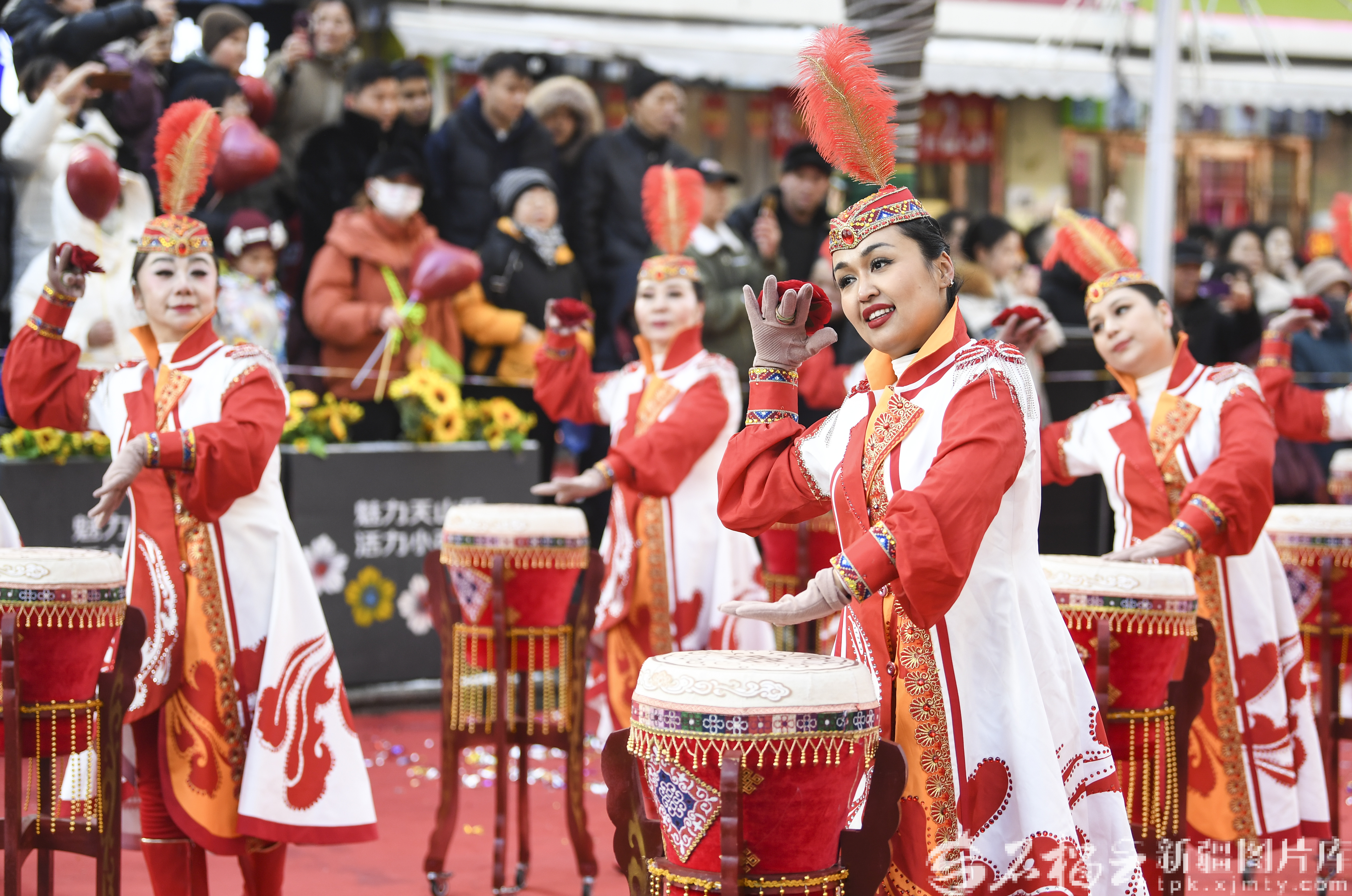 2月14日,乌鲁木齐市西门老街热闹非凡,“打起手鼓舞起龙”天山区社火闹新春活动在此举行。