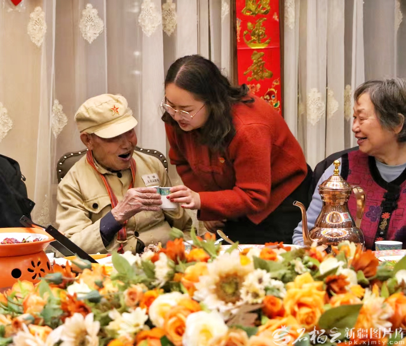 2月16日晚,社区工作人员给抗美援朝老战士敬茶。