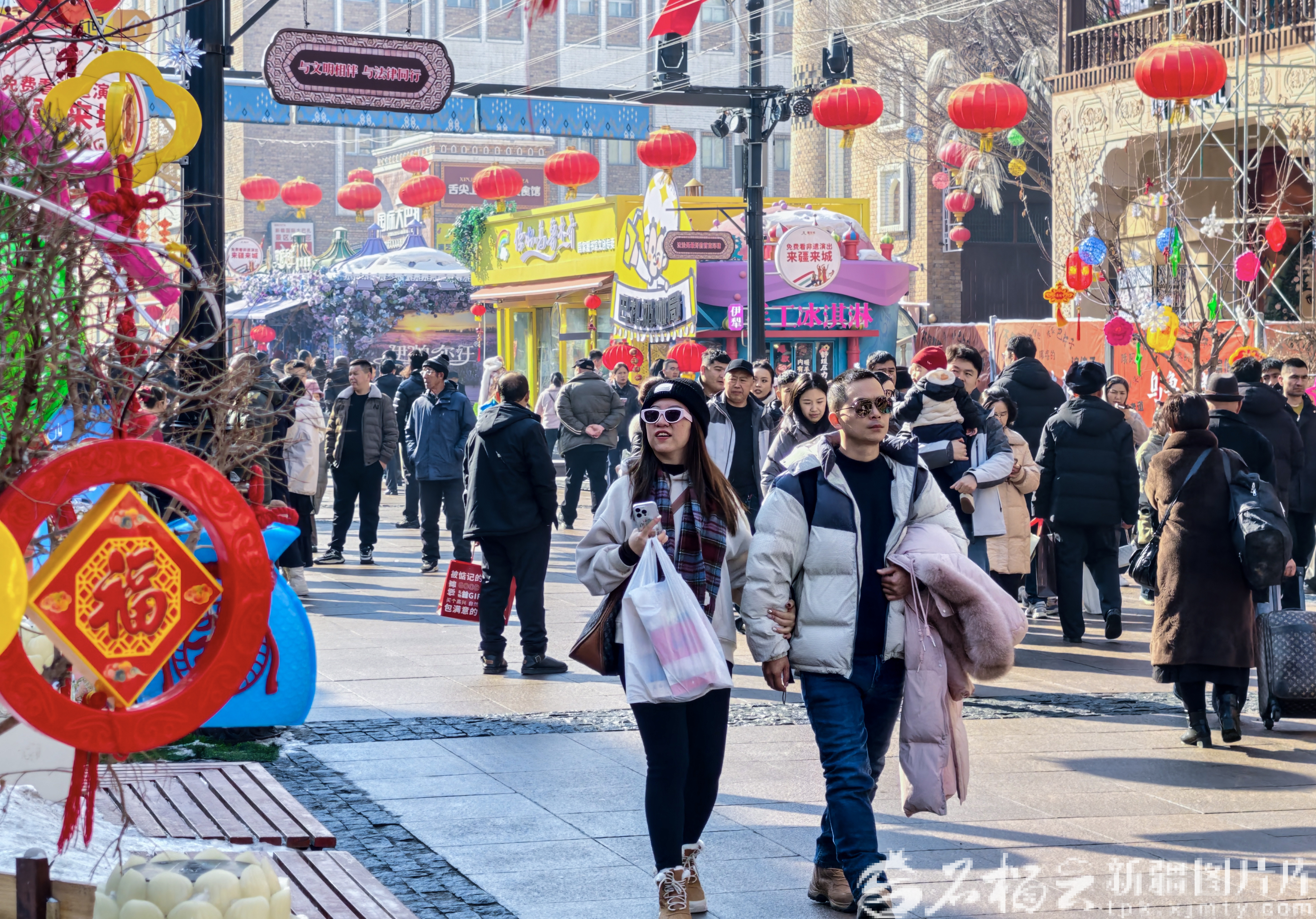 金马贺岁,福启新岁。各地游客逛巴扎、赏民俗、品美食,沉浸式体验丝路风情与新春喜悦,处处洋溢着团结奋进的节日氛围。