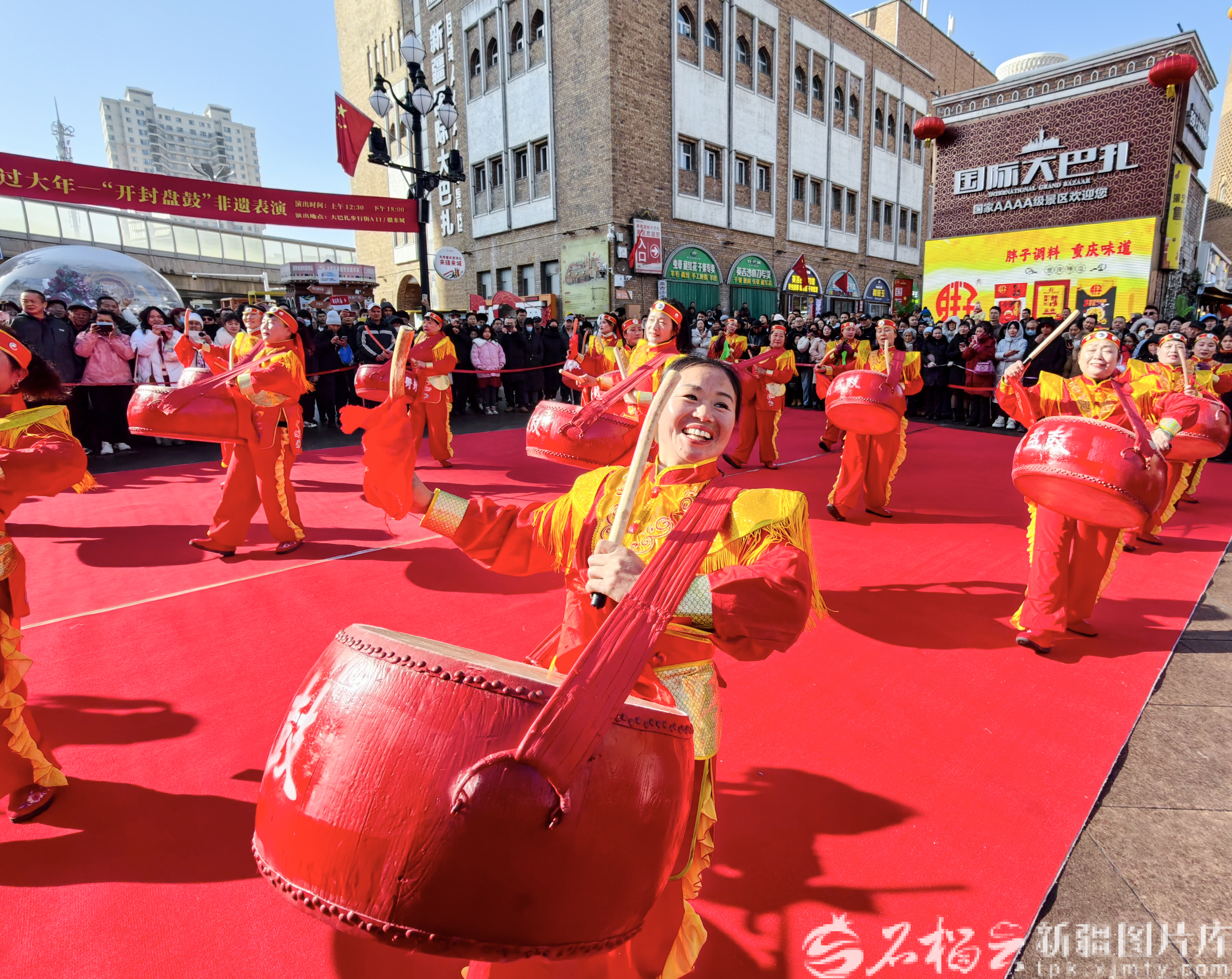 2月17日,来自河南省开封市的鼓手在新疆国际大巴扎景区内表演国家级非遗“开封盘鼓”。石榴云/新疆日报记者 周鹏摄