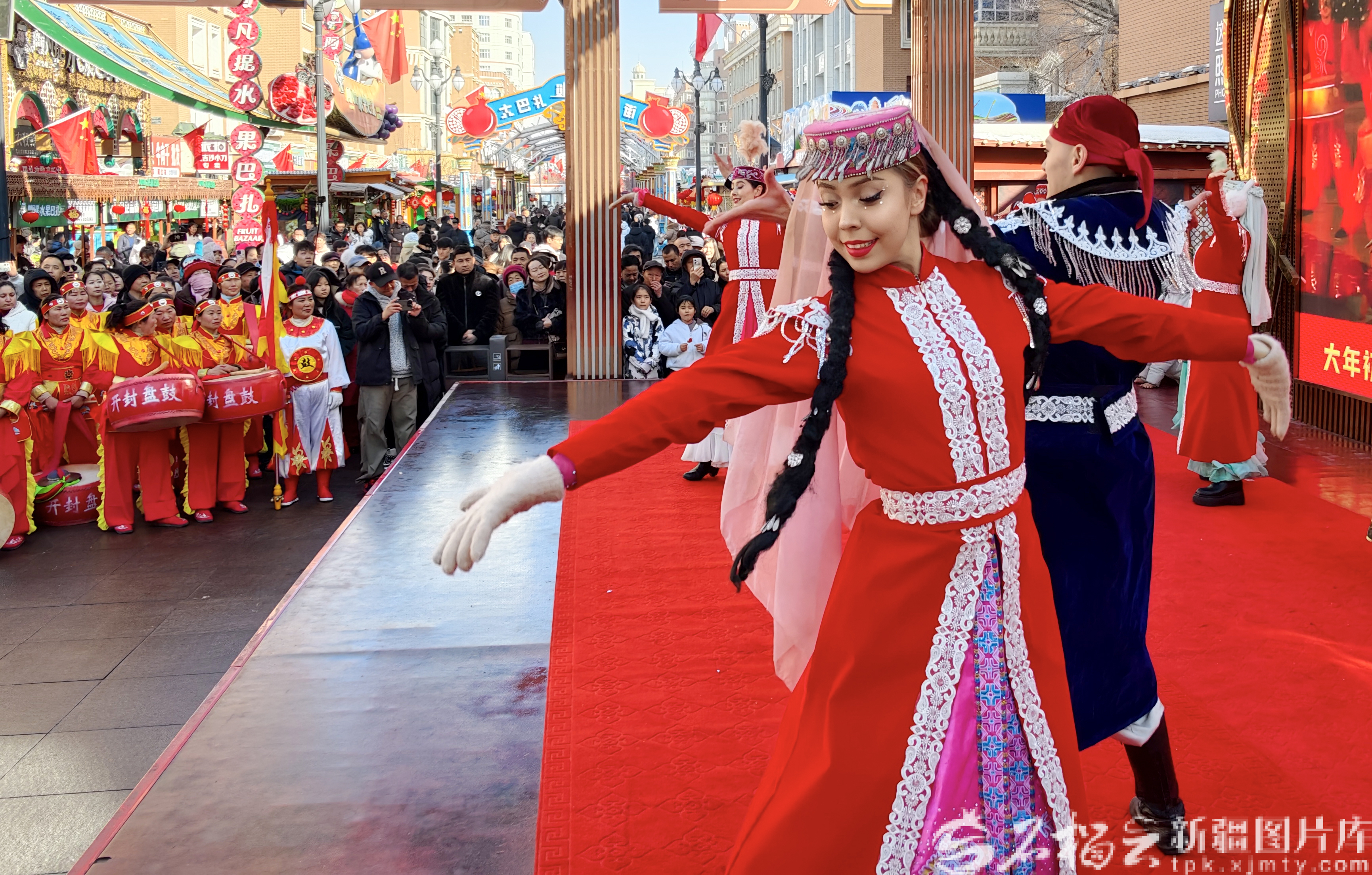 2月17日,舞蹈演员在新疆国际大巴扎景区内表演舞蹈。石榴云/新疆日报记者 周鹏摄