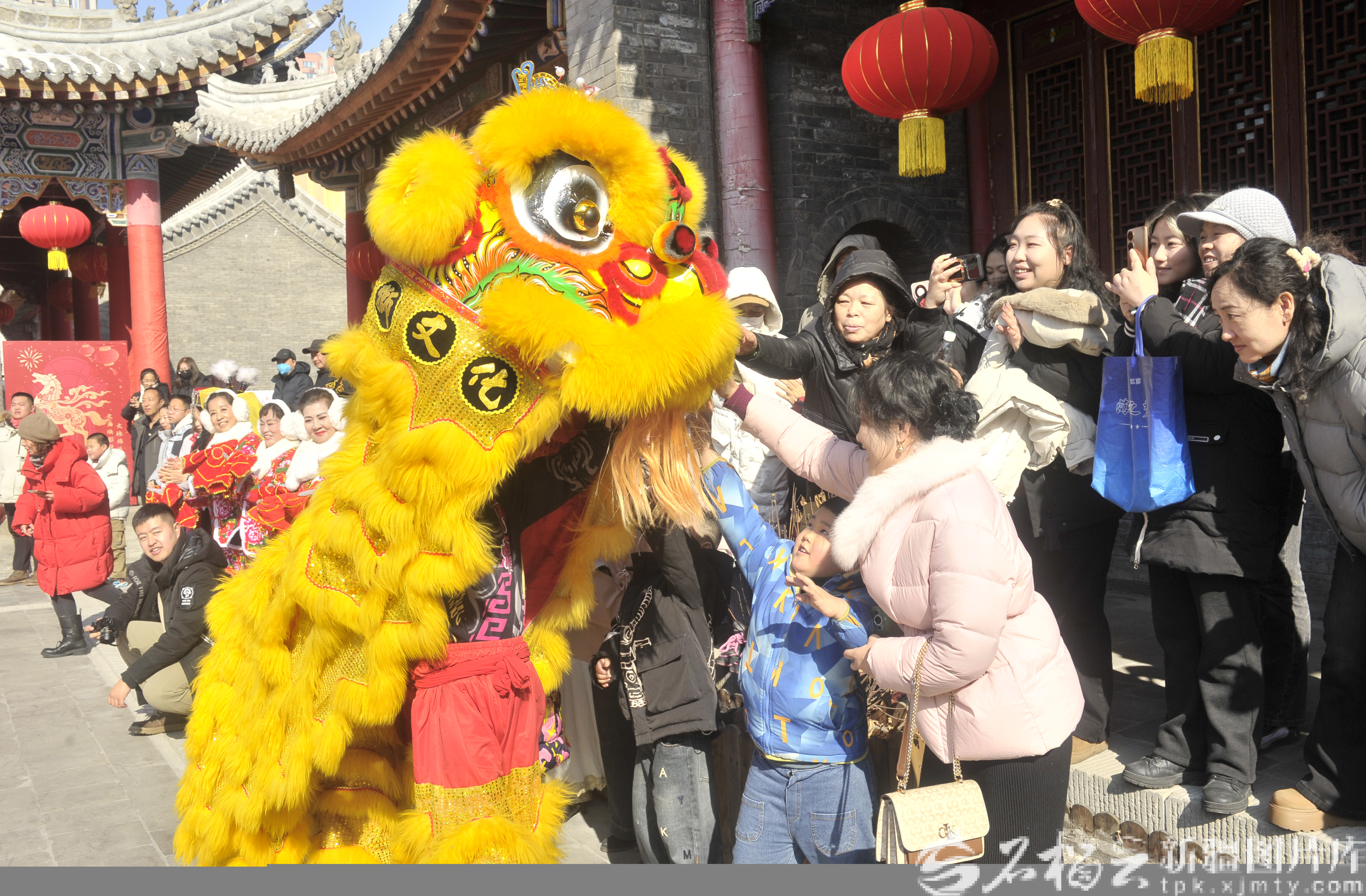 2月17日,舞狮演员与游客在文庙内互动。石榴云/新疆日报记者 王禹摄