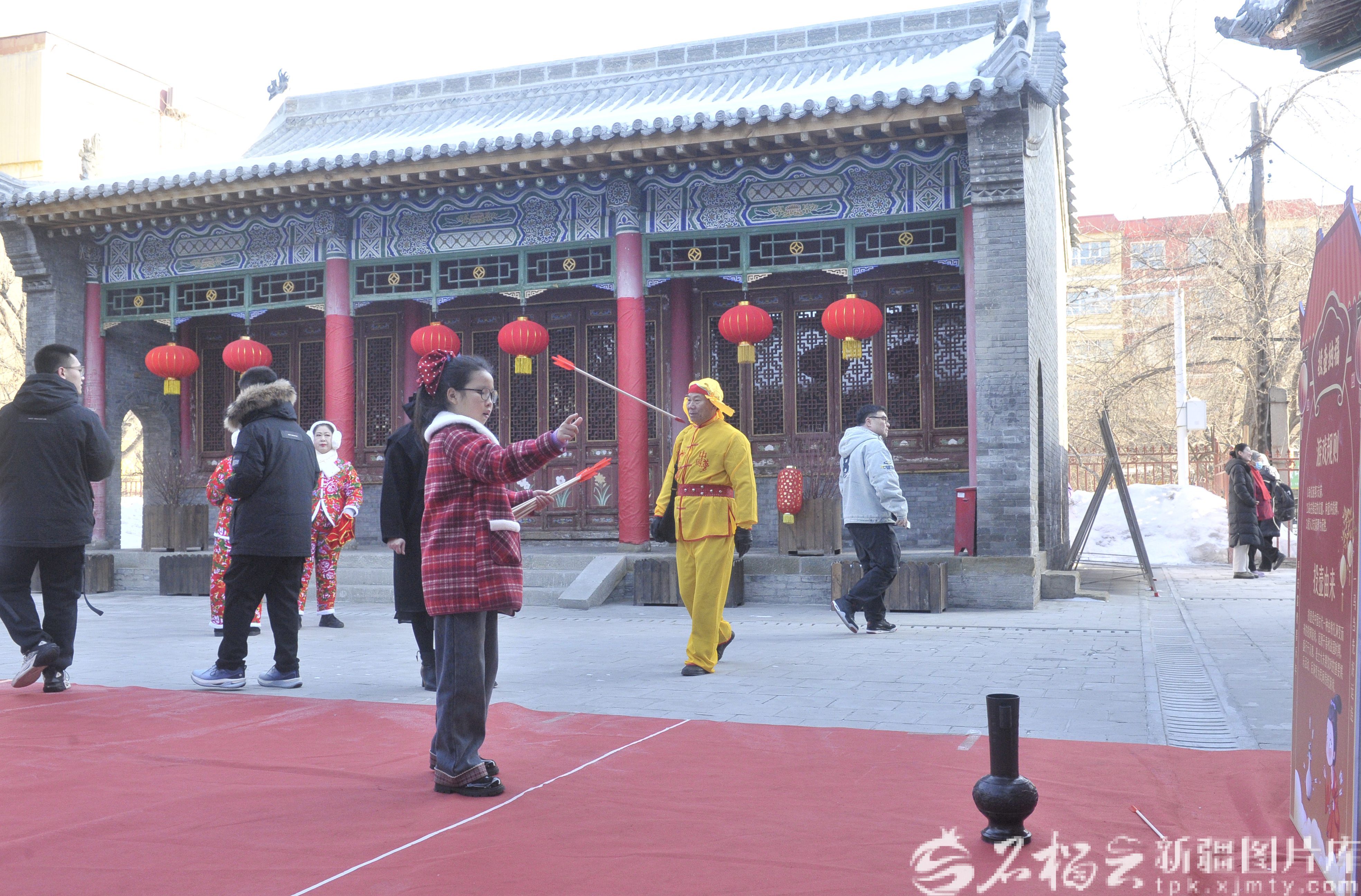 2月17日,小游客在文庙内体验投壶游戏。石榴云/新疆日报记者 王禹摄