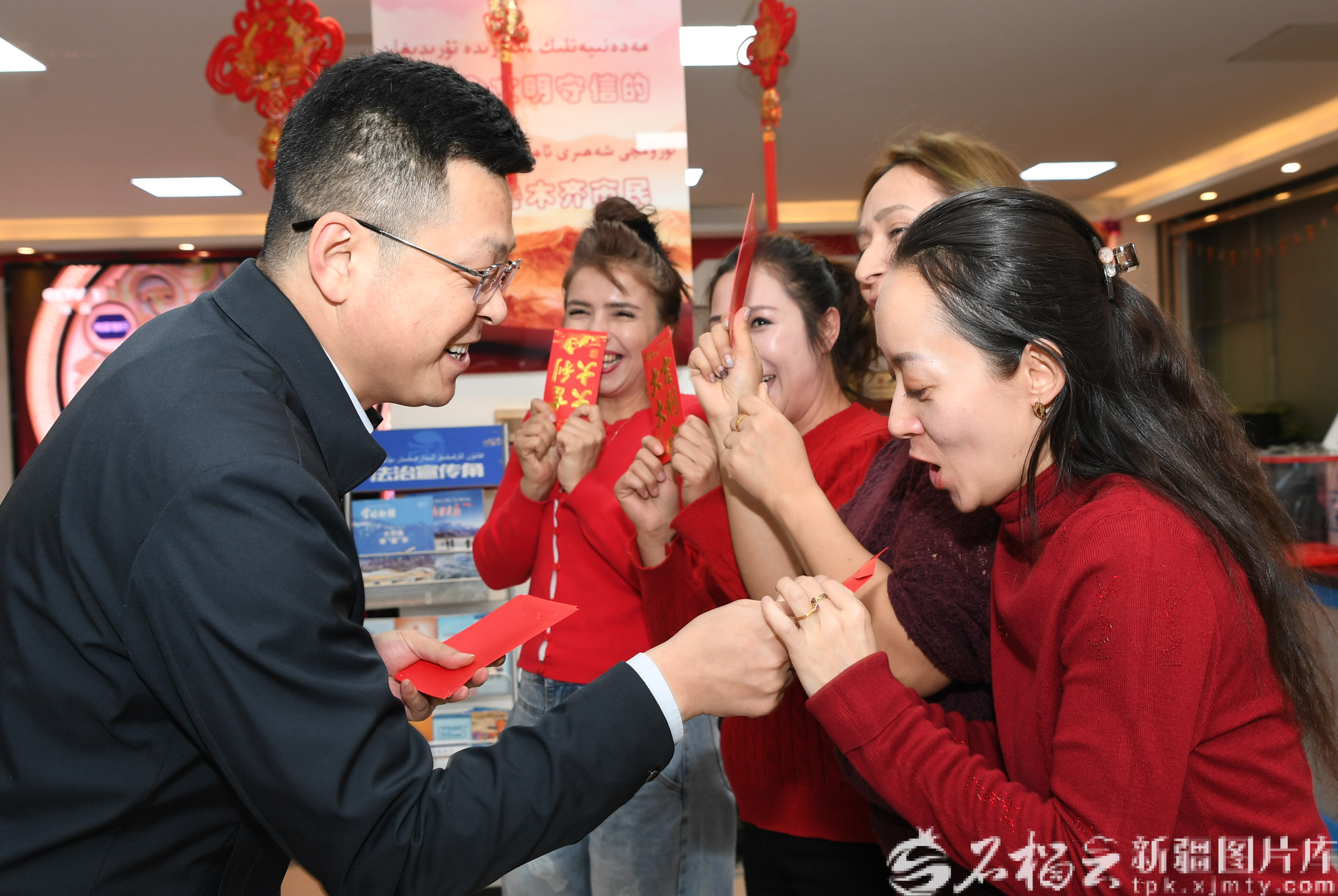 2月16日,乌鲁木齐市天山区二道桥街道固原巷社区举办“情暖固原巷·除夕共团圆”暖心年夜饭活动中为居民们发红包。石榴云/新疆日报记者 约提克尔·尼加提摄