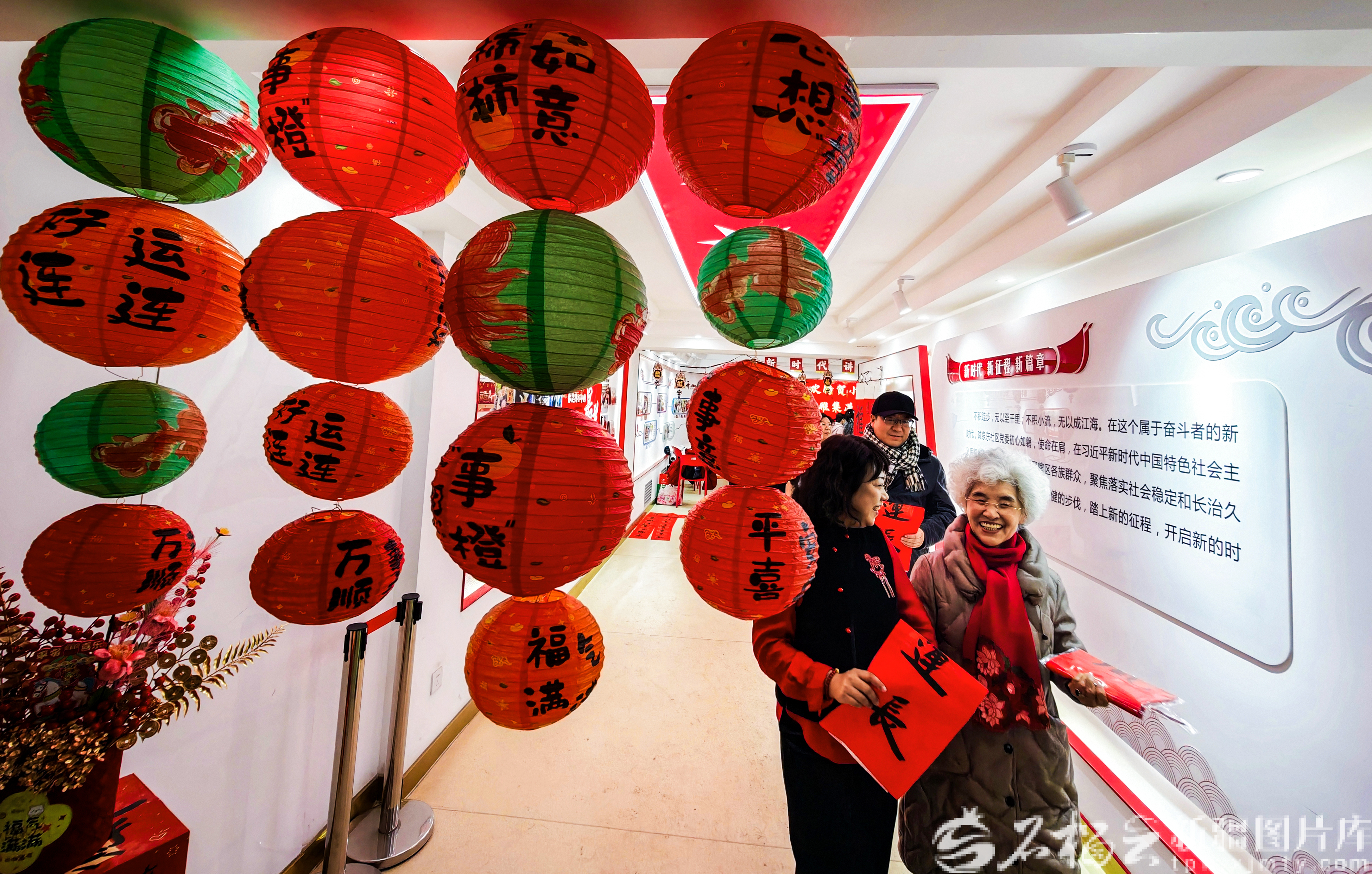 2月10日,在乌鲁木齐市天山区碱泉街道碱泉东社区,居民们从灯笼前走过。扎灯笼、做香包、写春联、剪窗花……这些传统“非遗”活动有着浓浓的年味。石榴云/新疆日报记者 周鹏摄