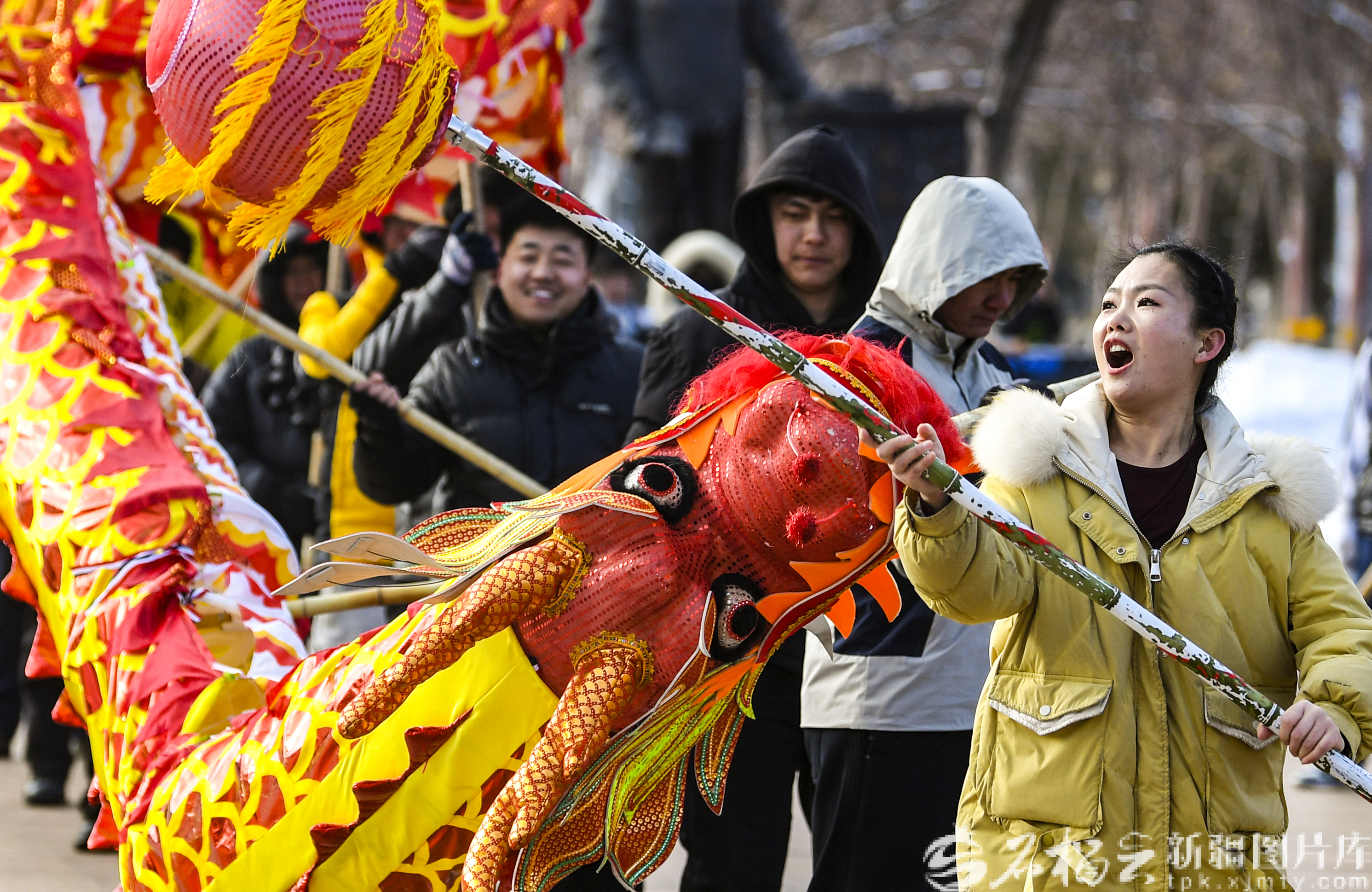 2月9日,张雅涵在米东区中心绿地广场和社火队员一起舞龙。这位已在乡镇文化中心工作多年的“领头羊”,用十余年的坚守与创新,为家乡的社火添上别样色彩。石榴云/新疆日报记者 汤永摄