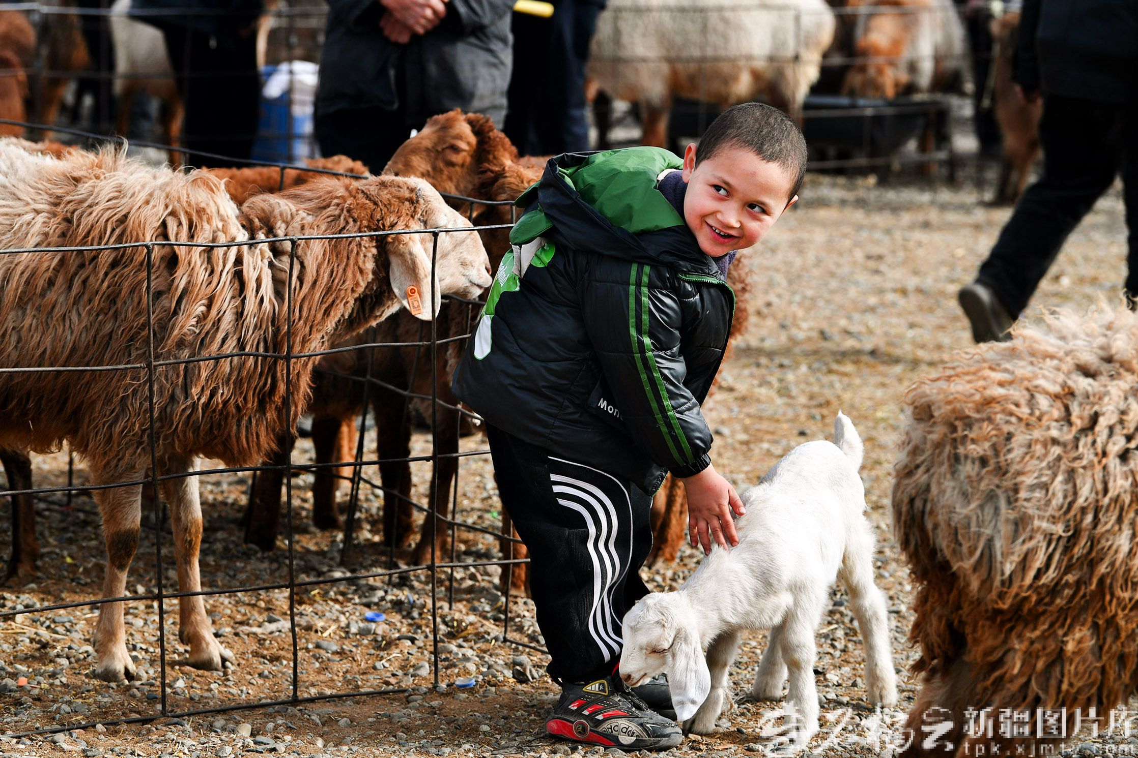 2月11日,小朋友在皮山县木吉镇巴扎活畜区和小羊玩耍。木吉镇巴扎人声鼎沸,吆喝声、谈笑声交织成曲。牲畜交易区更是热闹非凡,膘肥体壮的刀郎羊、温顺的绵羊、健壮的奶牛齐聚一堂,羊咩牛哞声不绝于耳。牧民们裹着厚皮袄,与买家热切议价,每一笔交易都承载着对新一年丰收的期盼。石榴云/新疆日报记者 约提克尔·尼加提摄