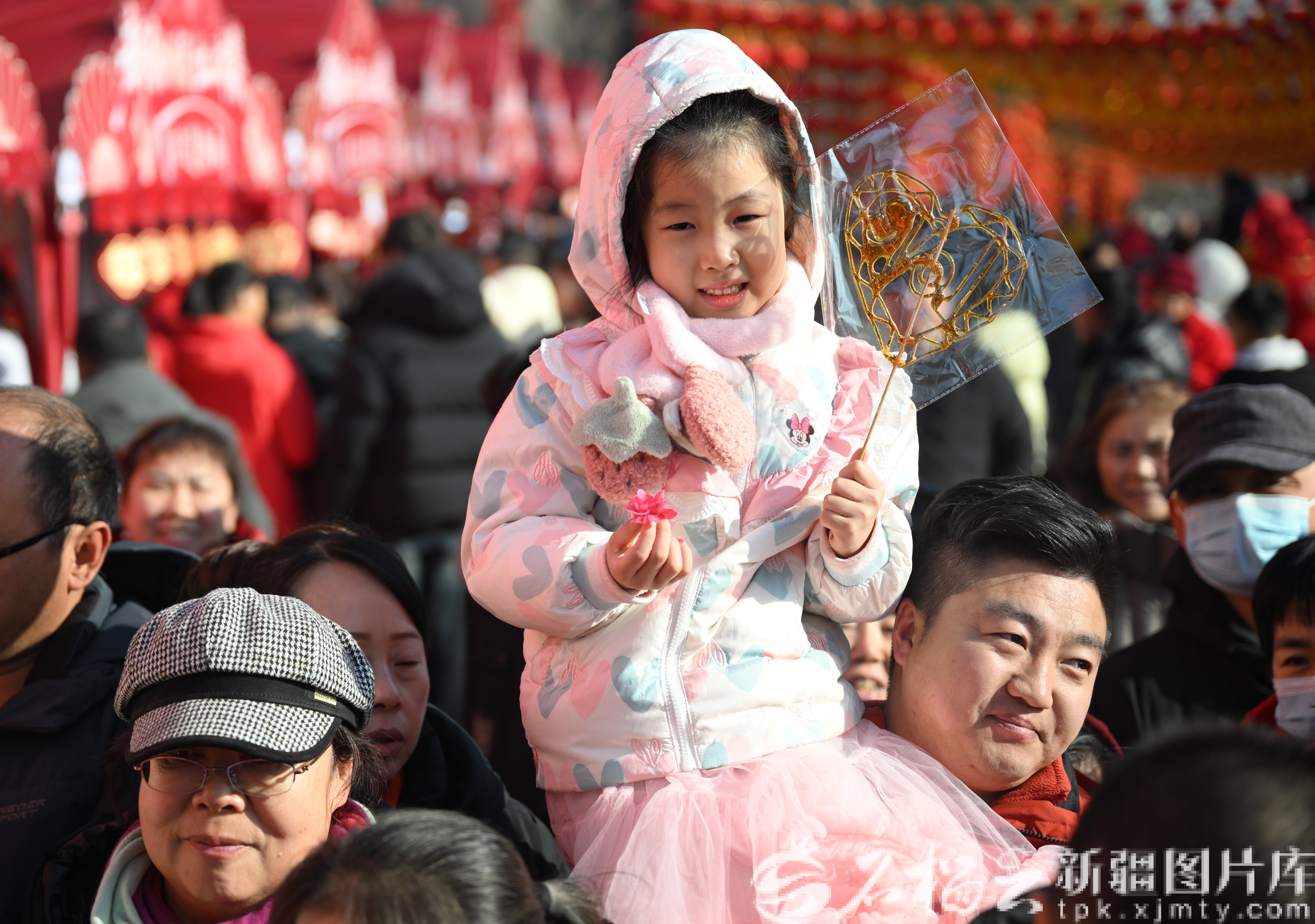 2月18日,一位小朋友坐在父亲肩头,欣赏社火表演。石榴云/新疆日报记者 韩亮摄