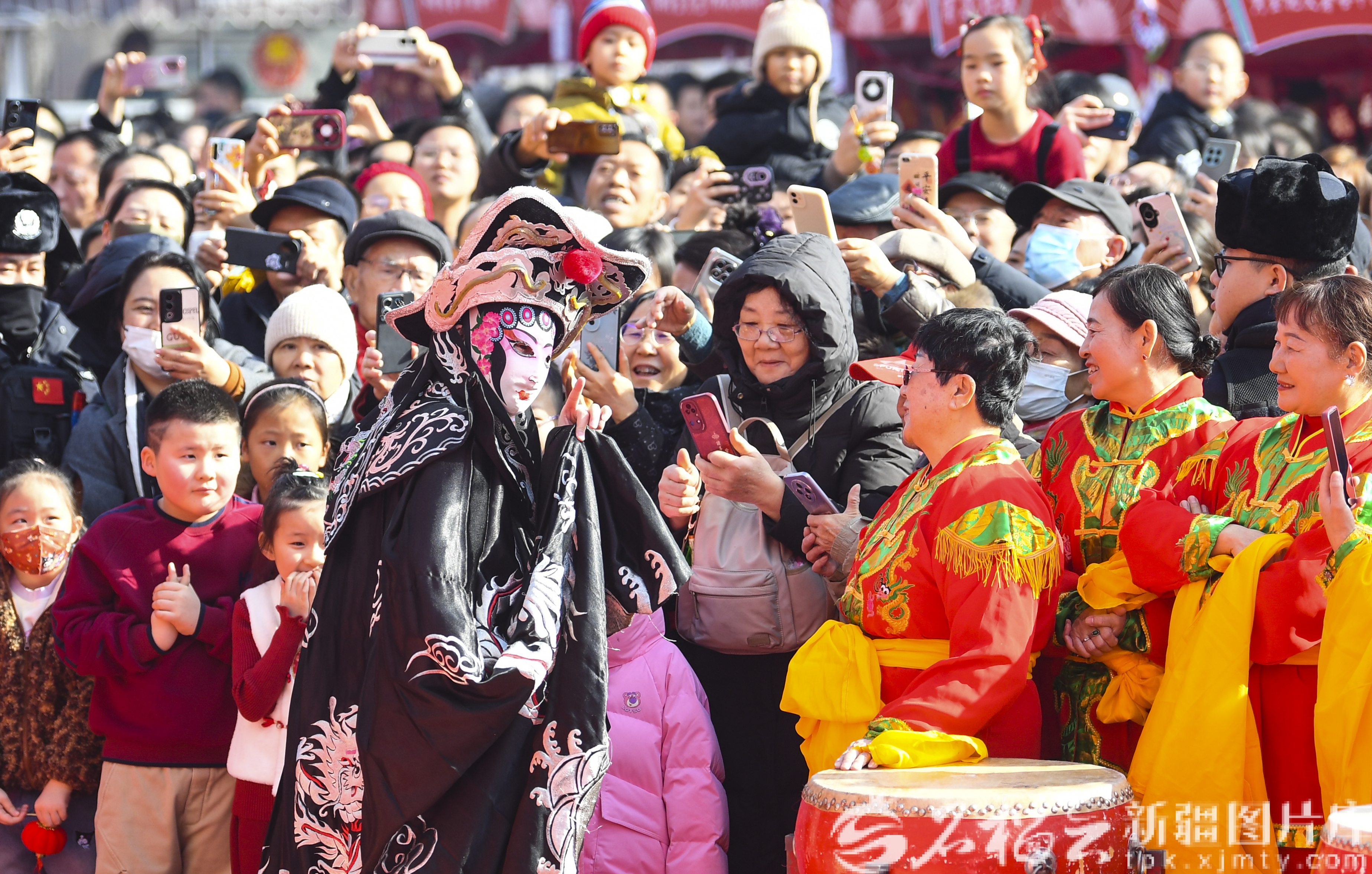 2月18日,乌鲁木齐市红山公园第九届新春文化庙会,川剧变脸演员与市民互动。石榴云/新疆日报记者 汤永摄