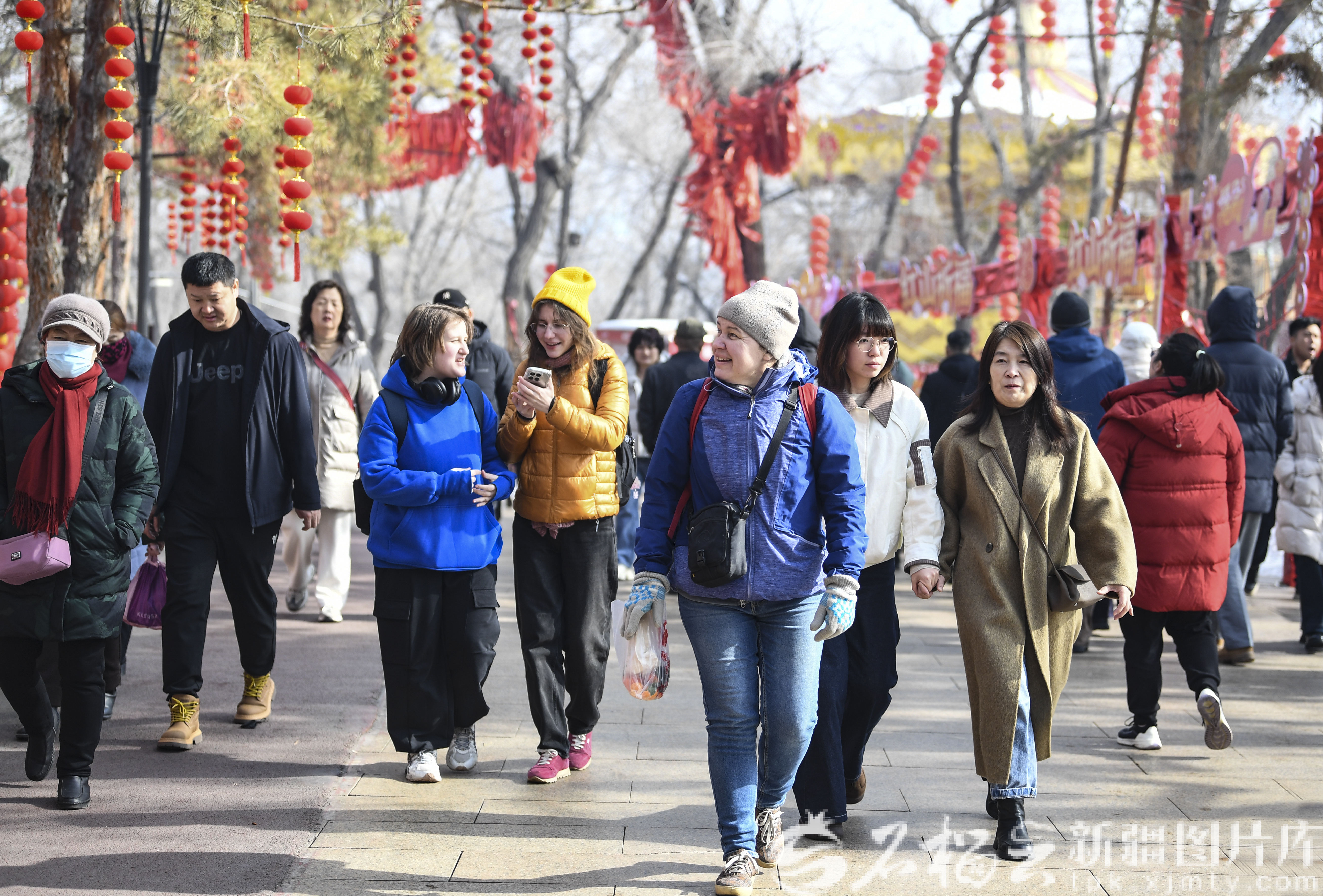 2月18日,外国朋友在乌鲁木齐街头感受新春氛围。石榴云/新疆日报记者 汤永摄