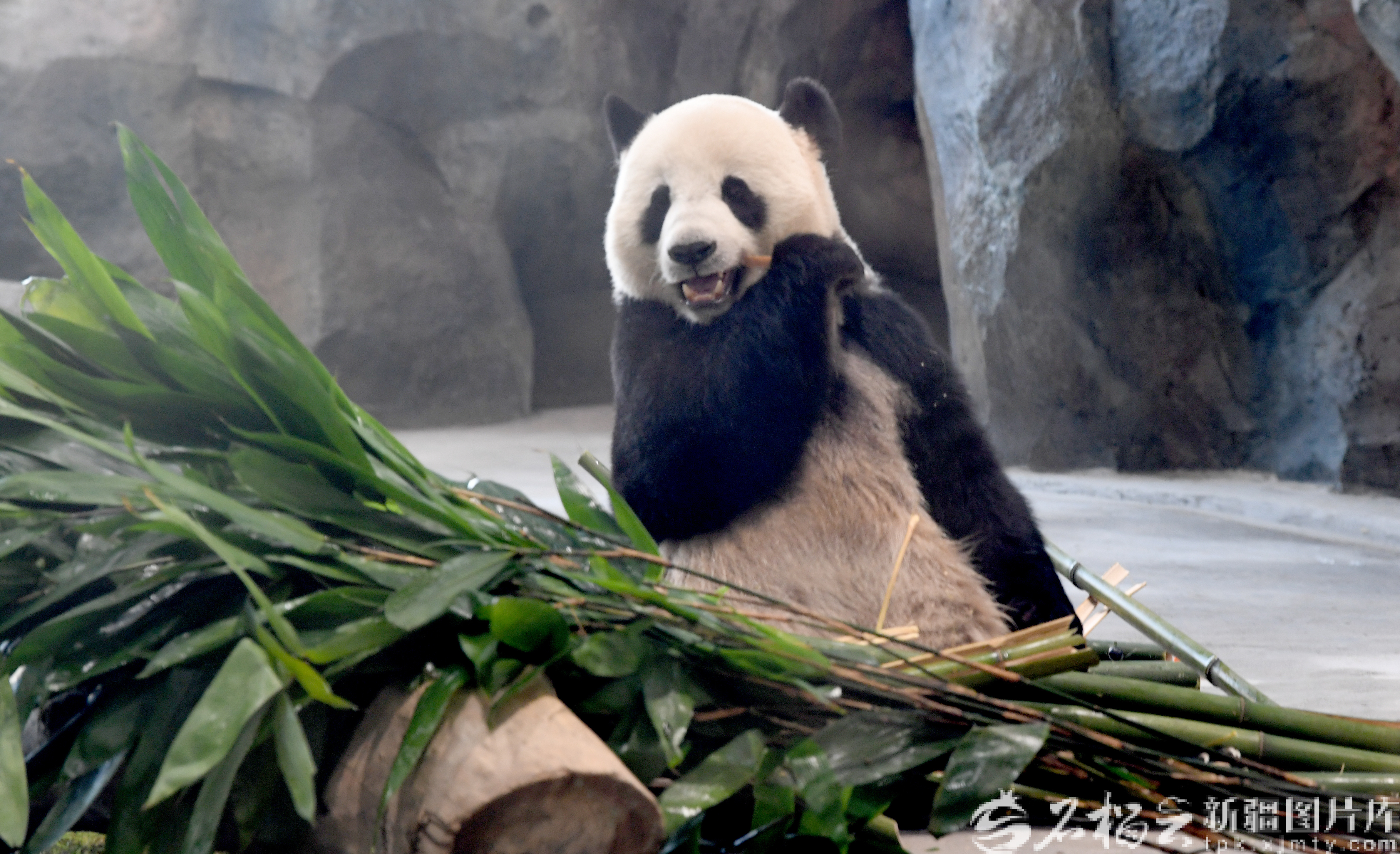 2月19日,乌鲁木齐水上乐园大熊猫馆,“德瑞”正在吃竹子。