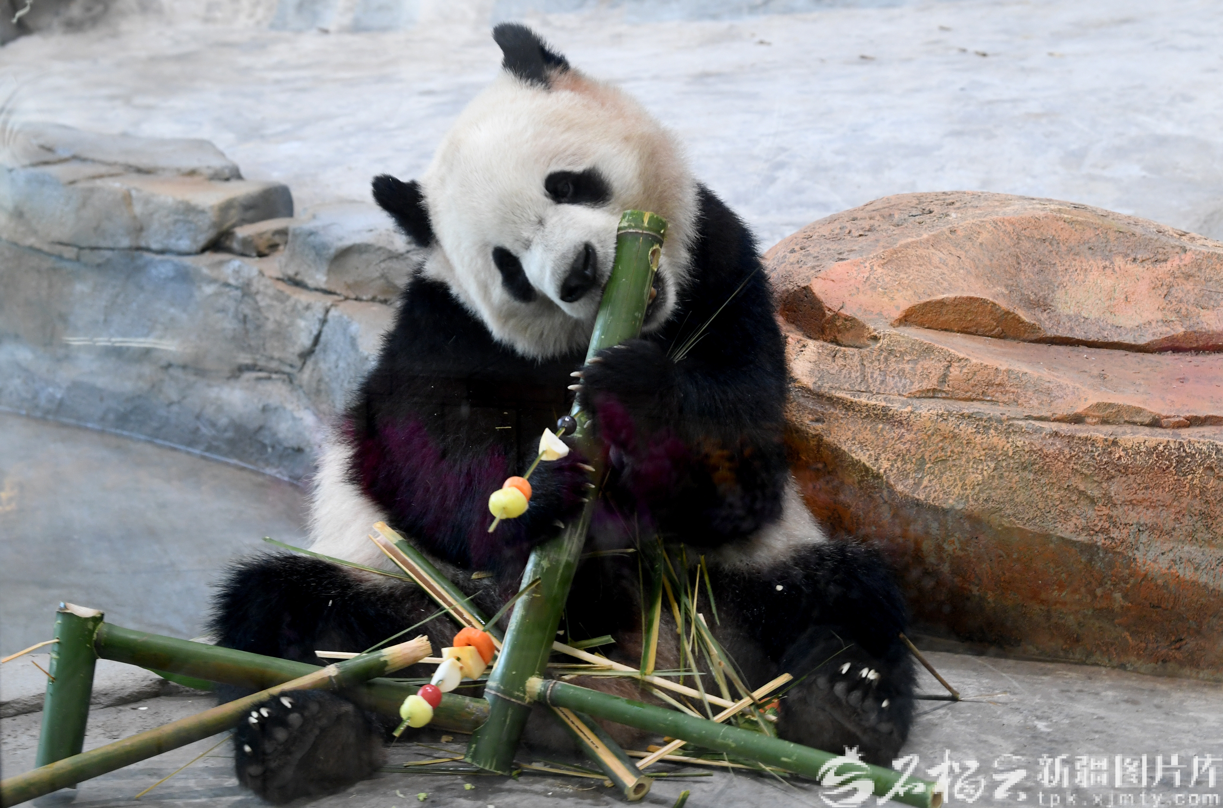 2月19日,乌鲁木齐水上乐园大熊猫馆,“宝元”边吃边玩耍。