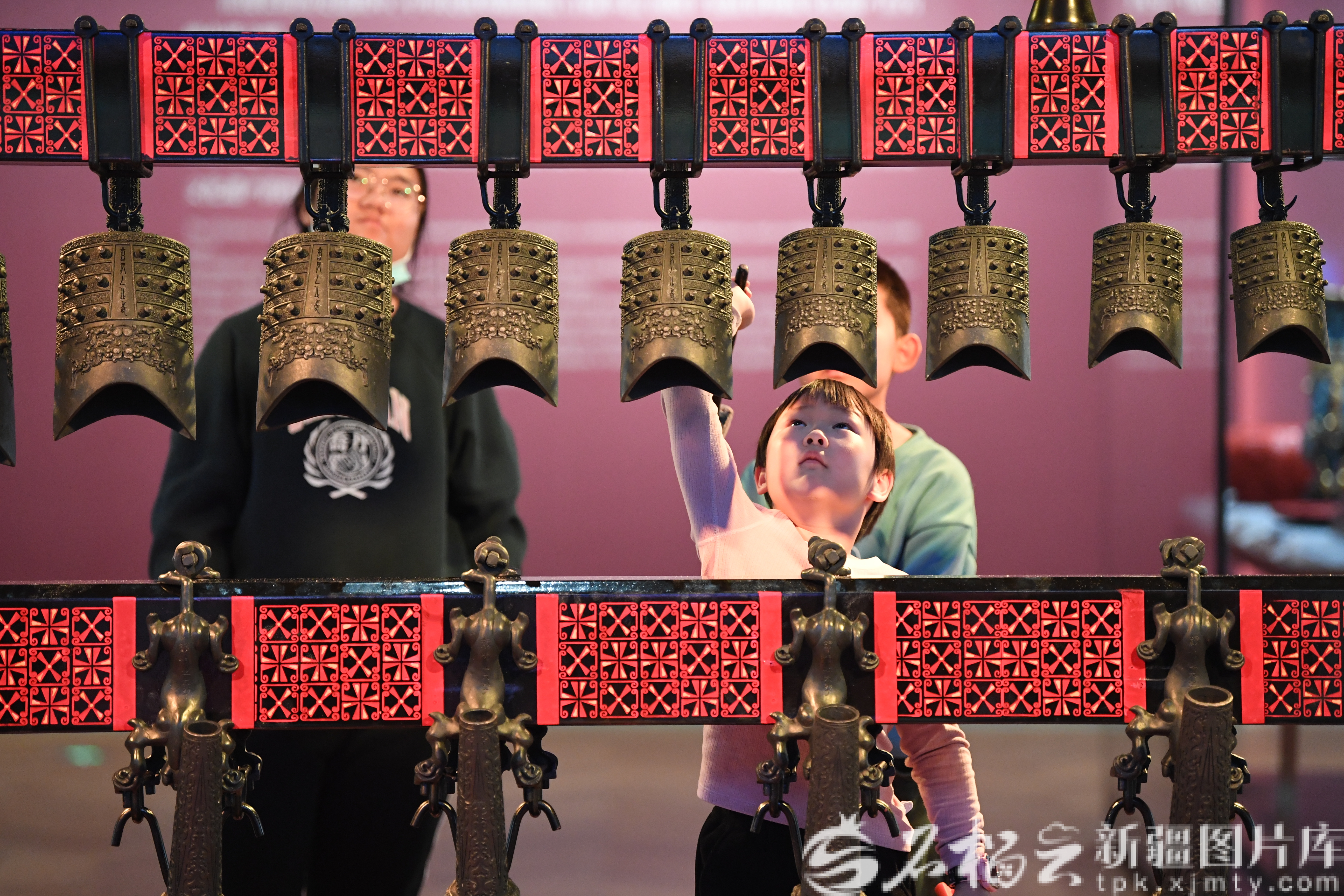 2月20日,小朋友在新疆非物质文化遗产馆体验编钟。