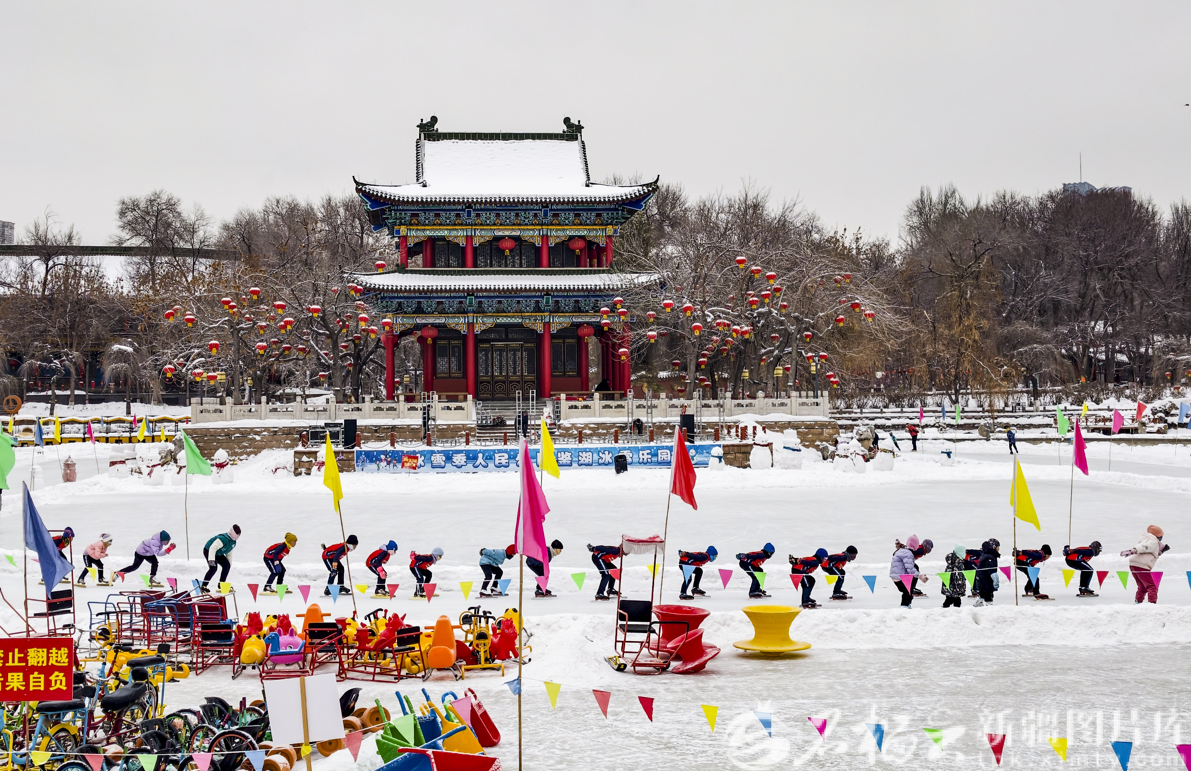 2月20日,青少年在乌鲁木齐人民公园练习滑冰。