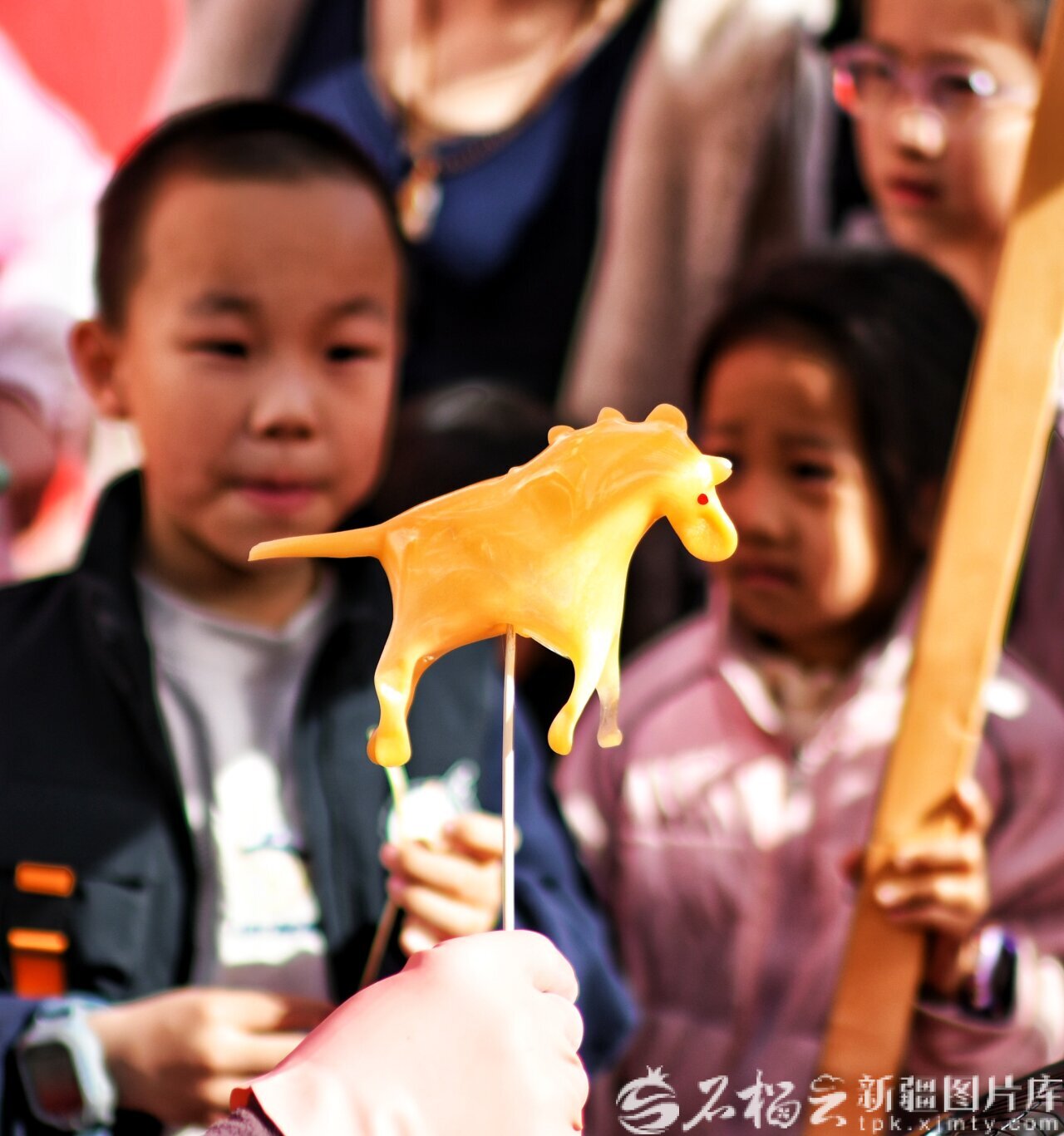 2月22日,库尔勒梨城美食街,小朋友在观赏糖塑技艺。石榴云/新疆日报记者 王立华摄
