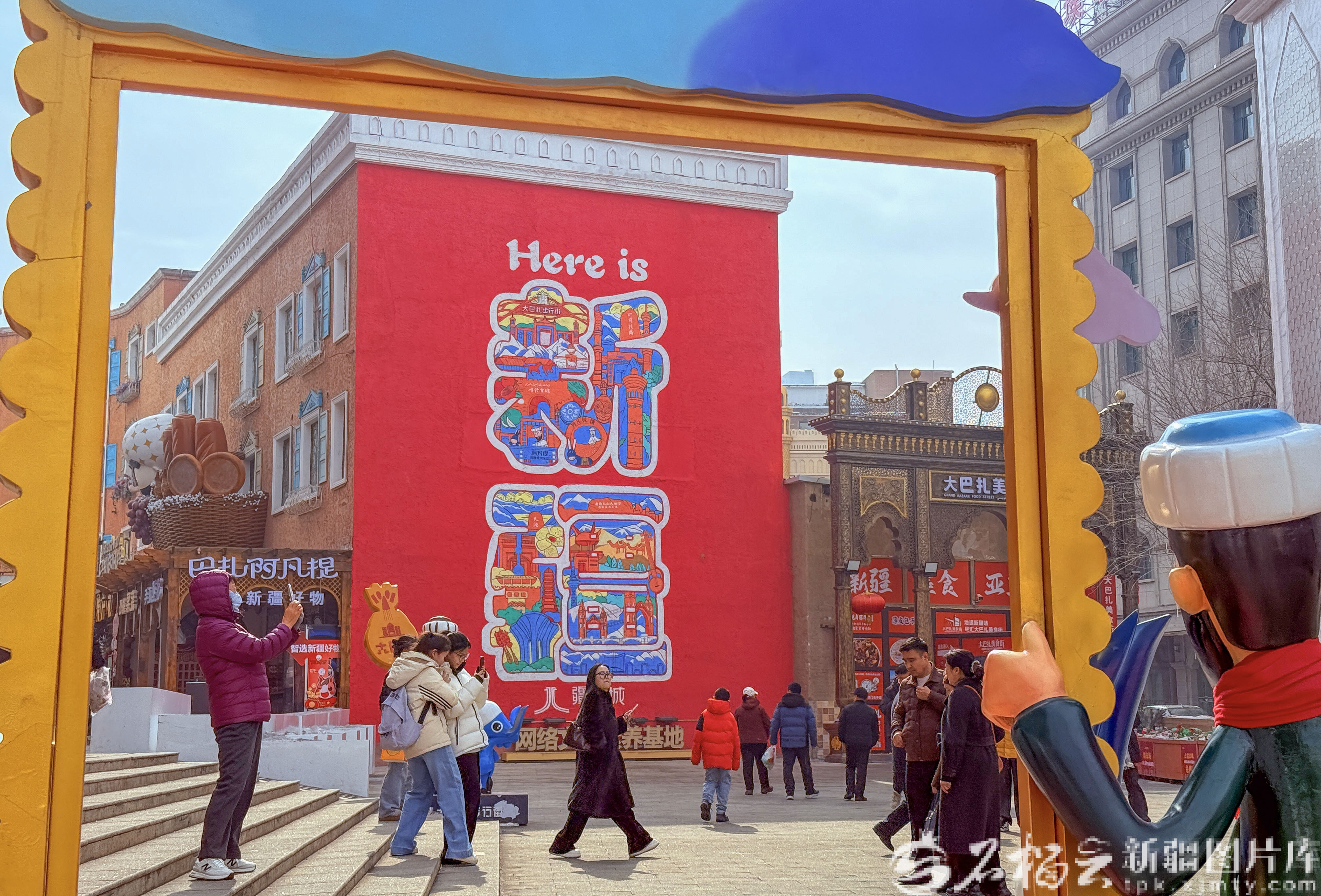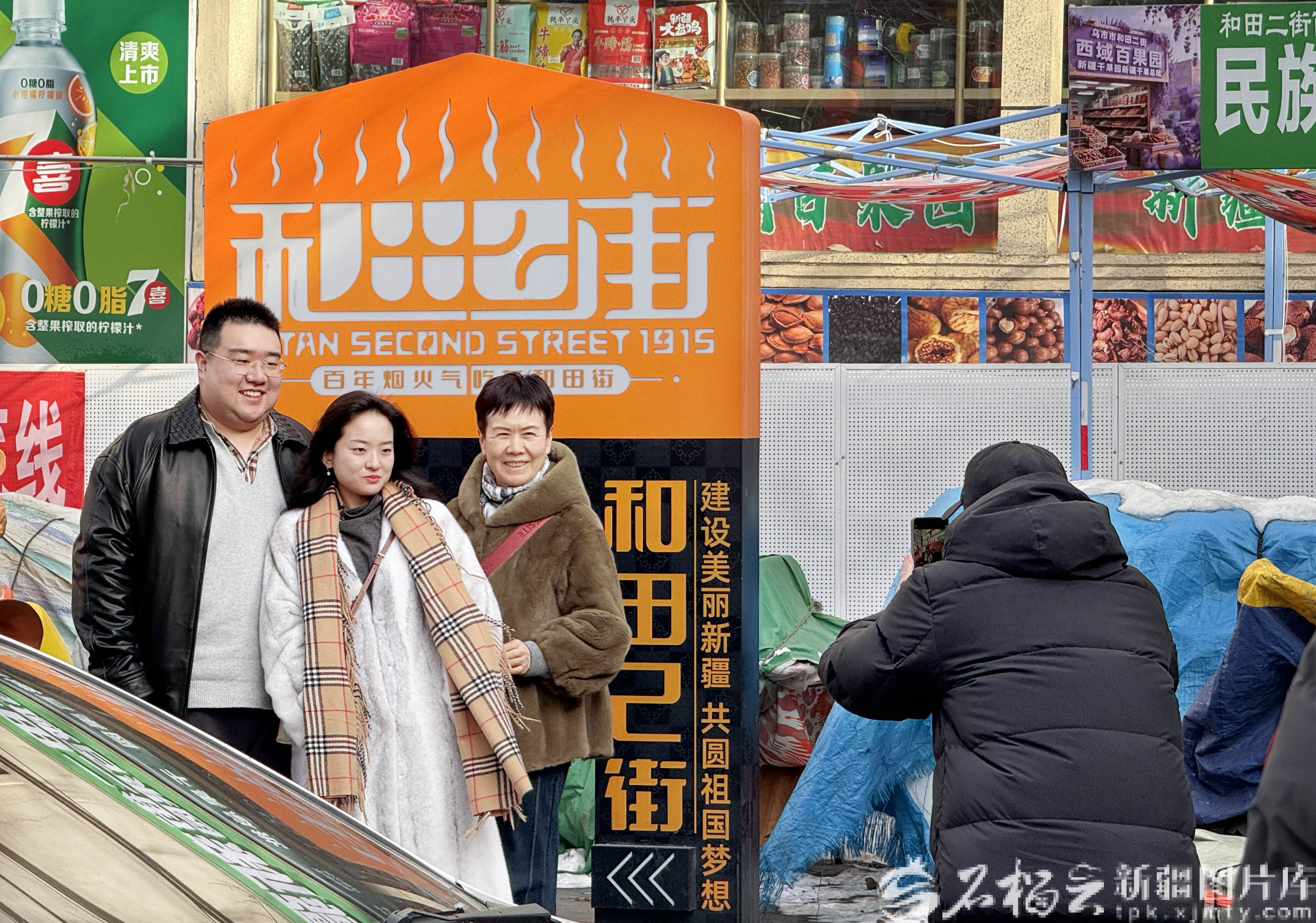 2月23日,游客在乌鲁木齐市和田二街拍照打卡。